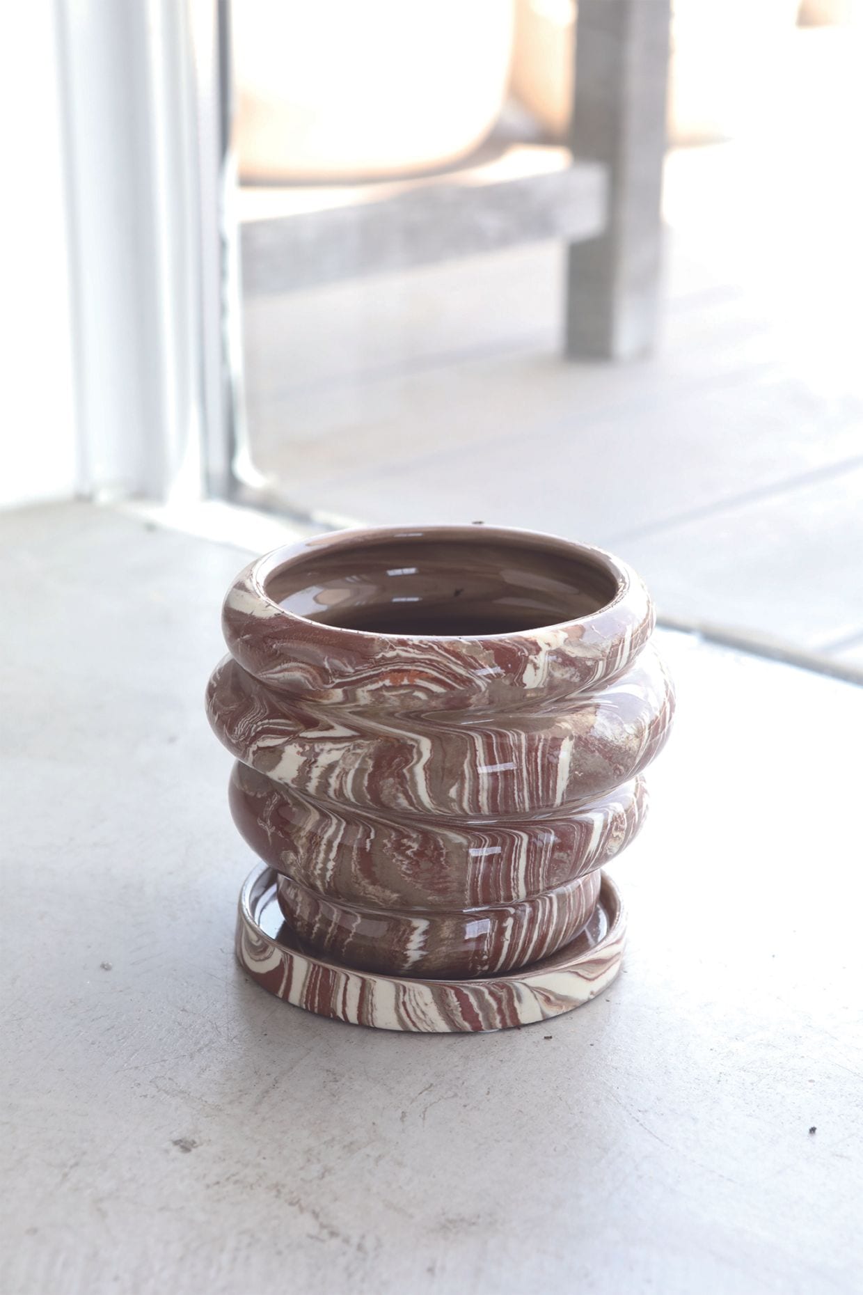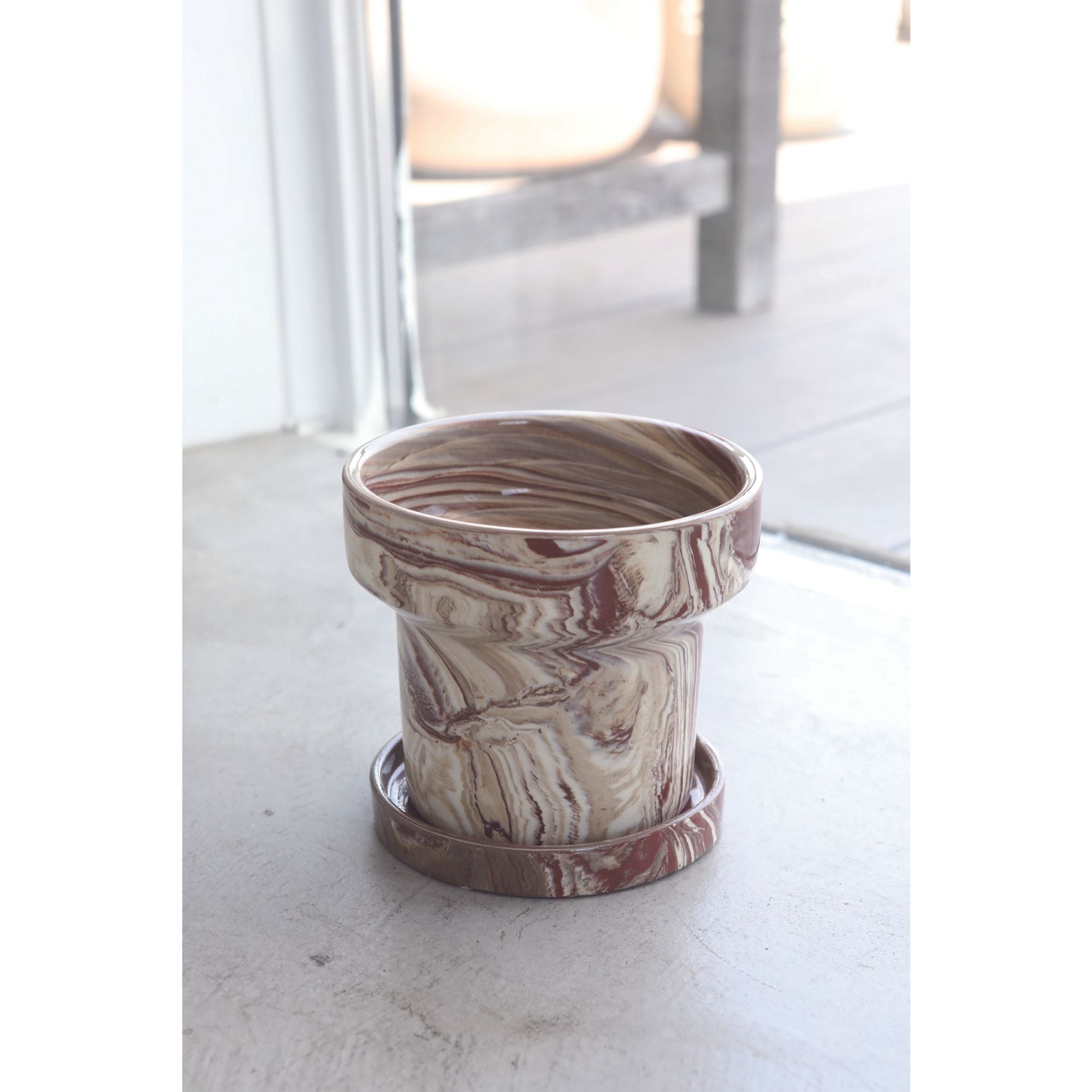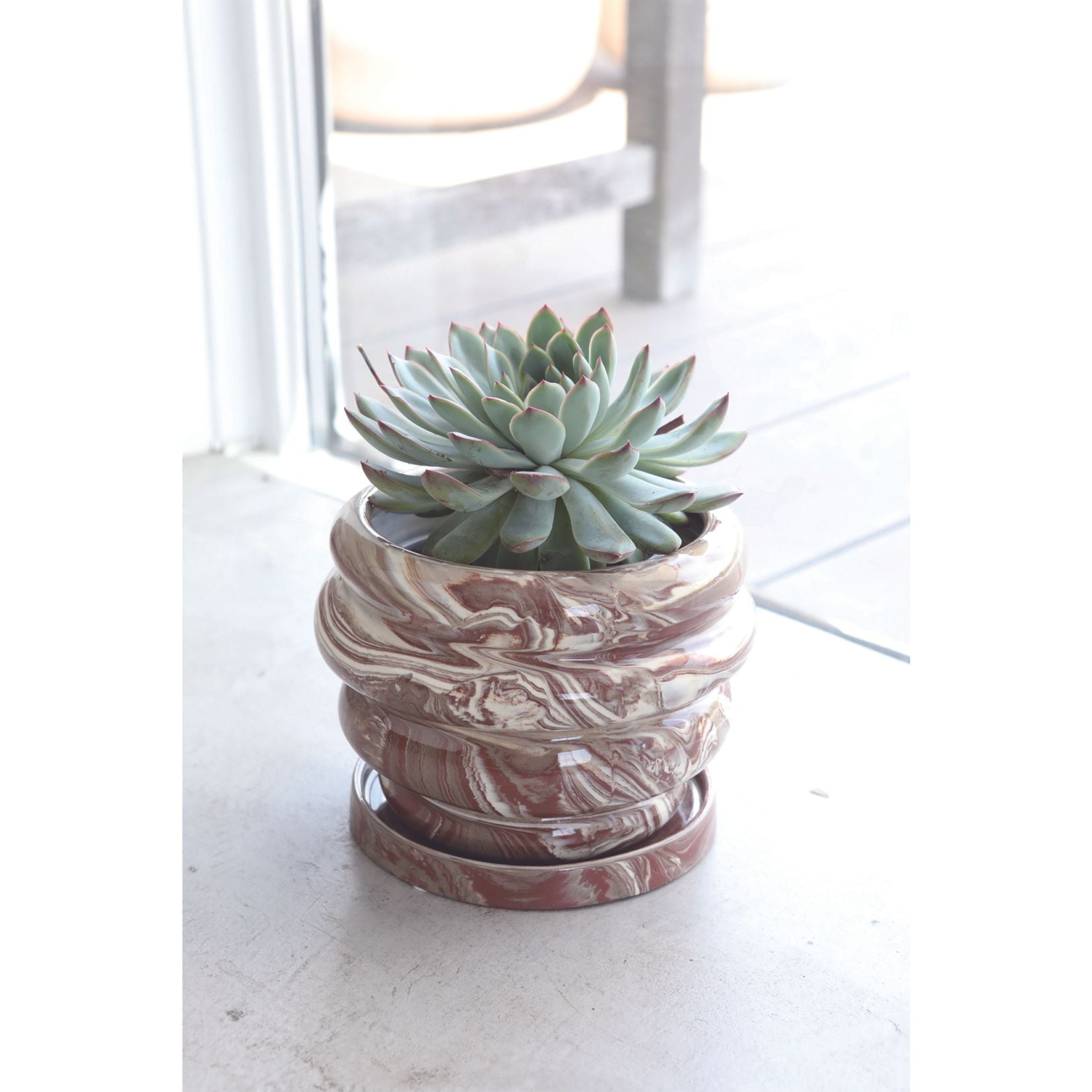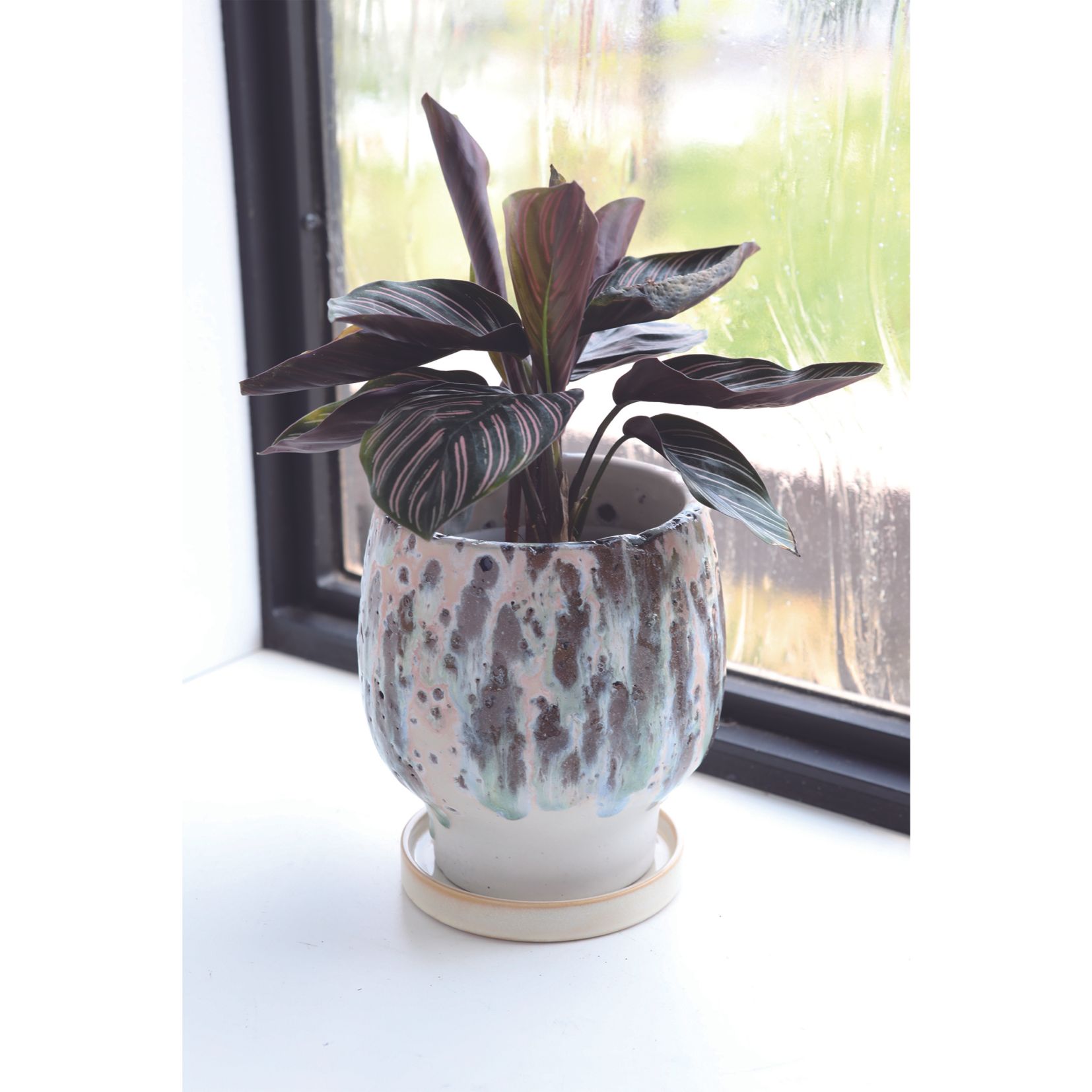 立体感のある花模様のレリーフが目を引く、クラシカルな雰囲気のラウンドポット。