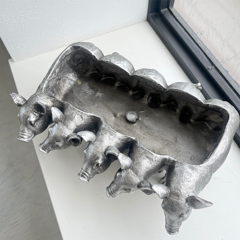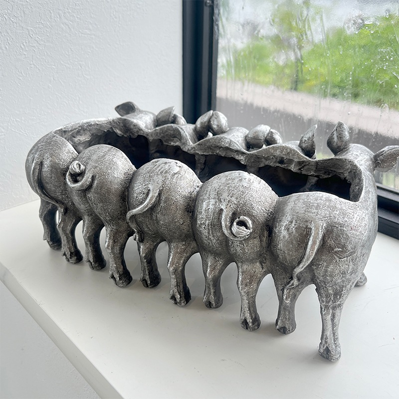 5匹の子ぶたがぴったりと並んだ、個性的なデザインのプランター。