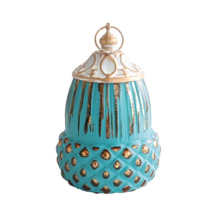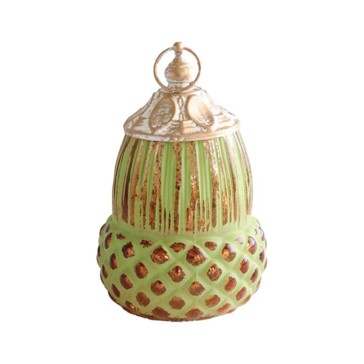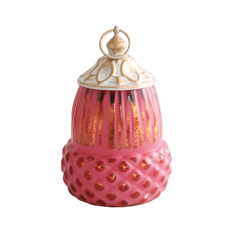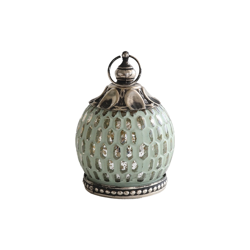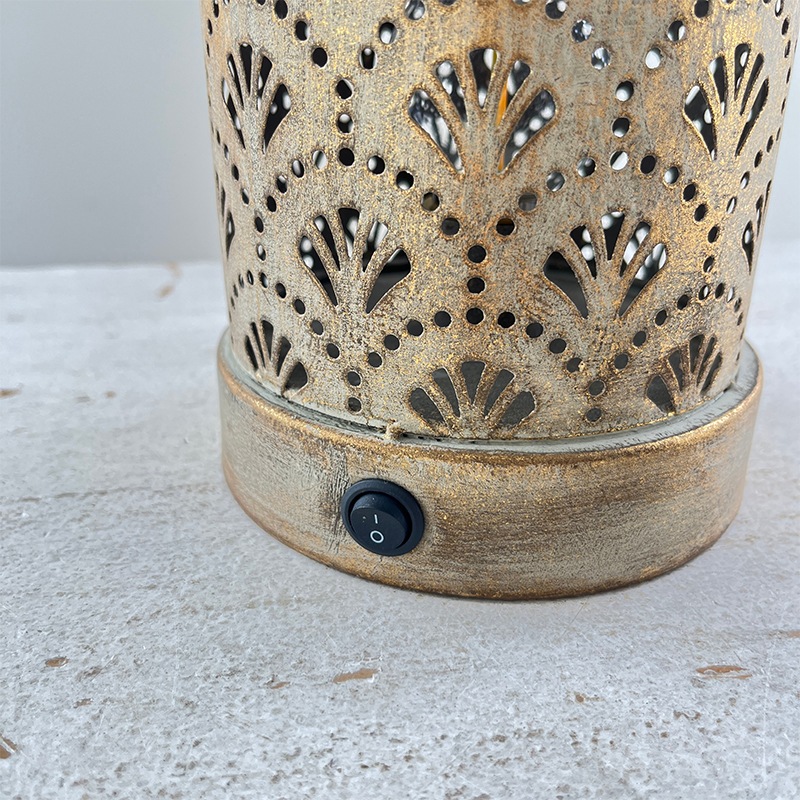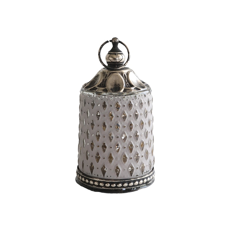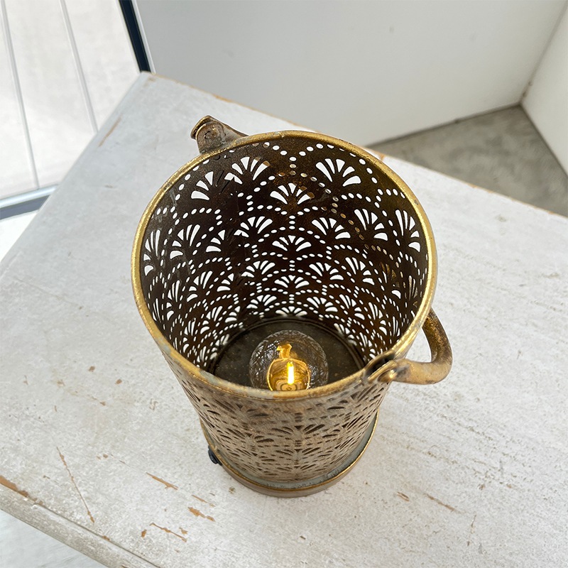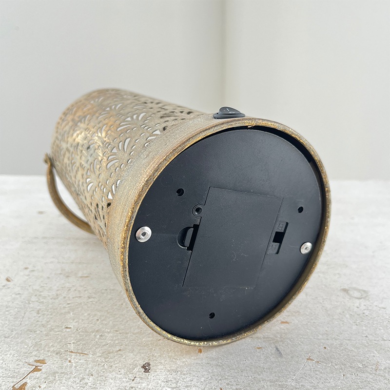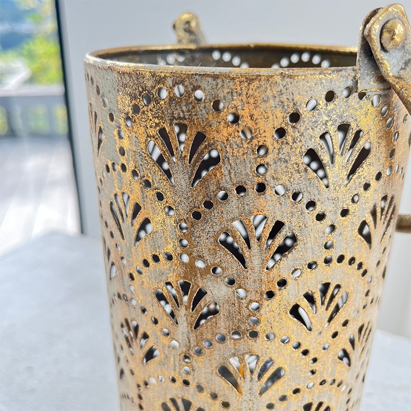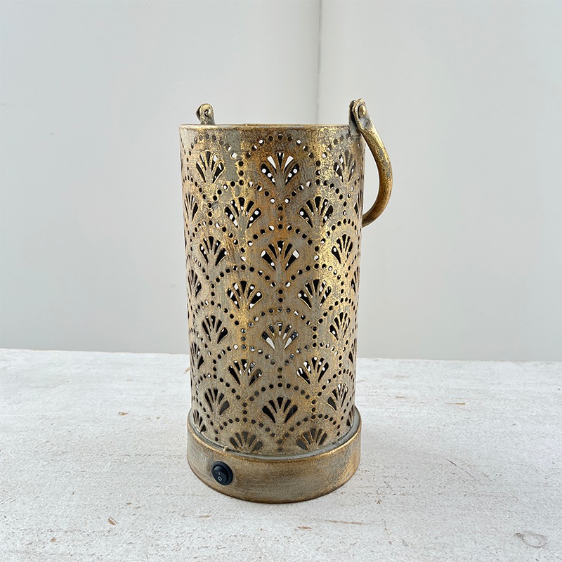 繊細な模様の透かし彫りが目を引く、円筒型のメタルランタン。