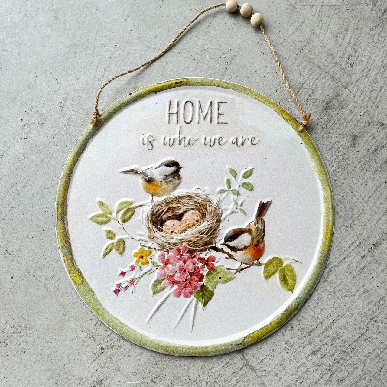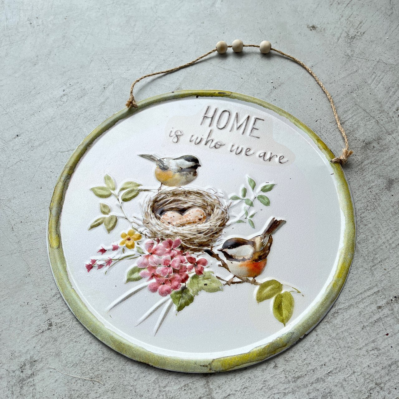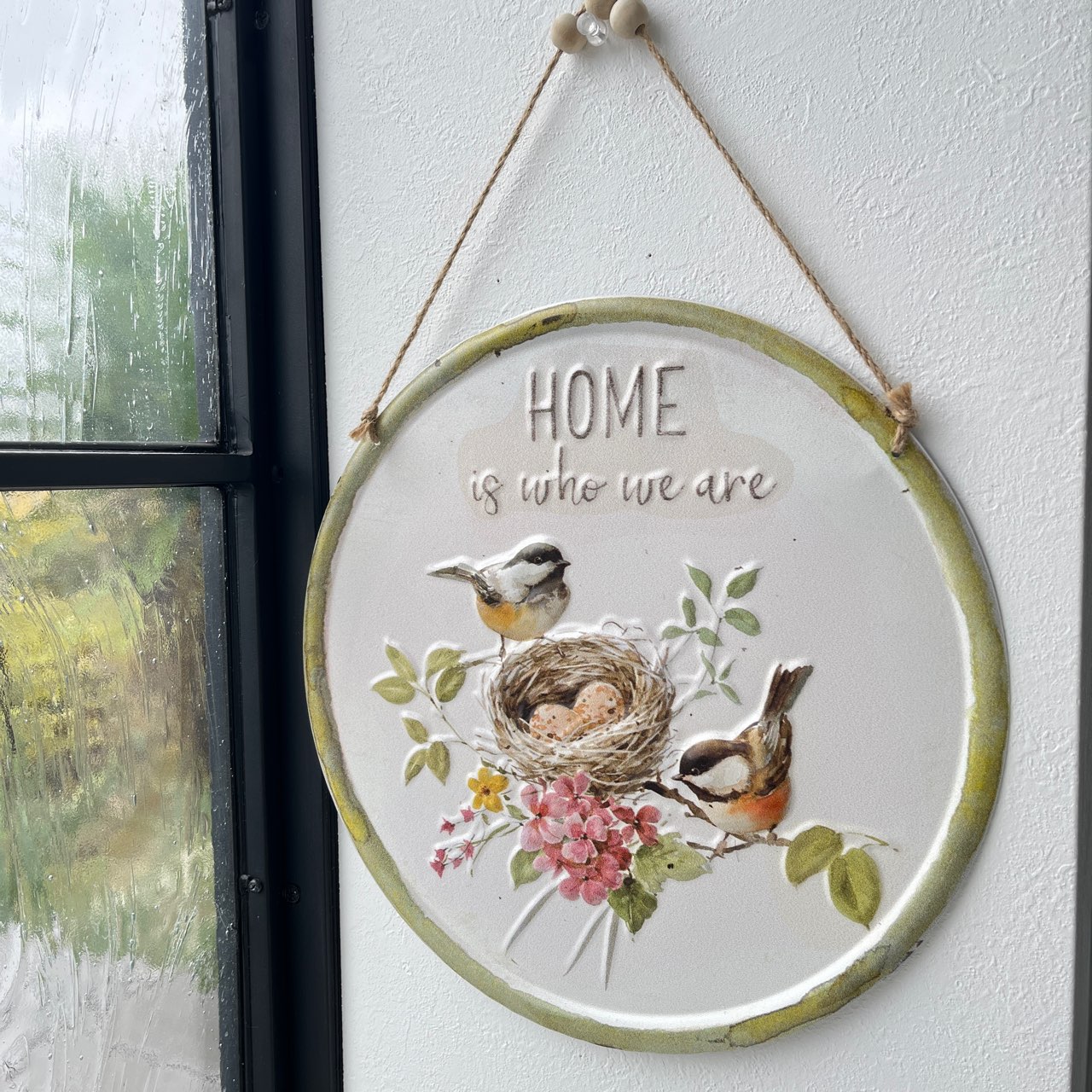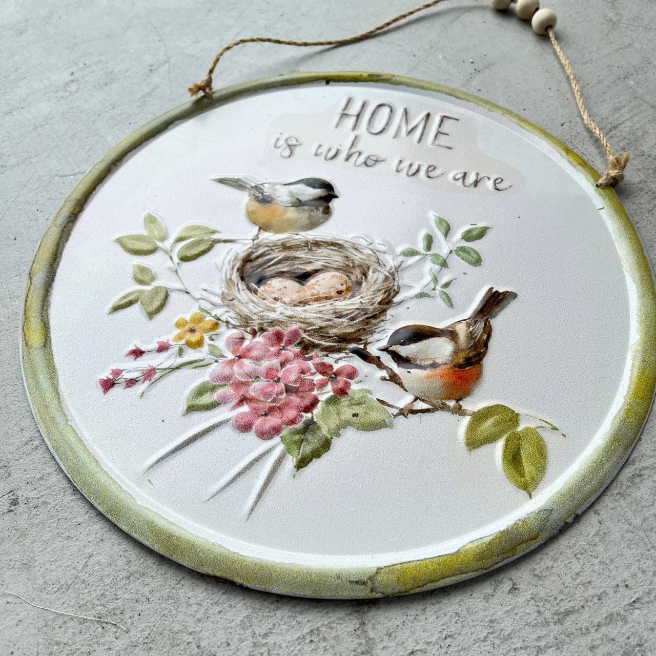 「HOME is who we are」の優しい言葉が心に響く、ラウンド型のウォールプレート。