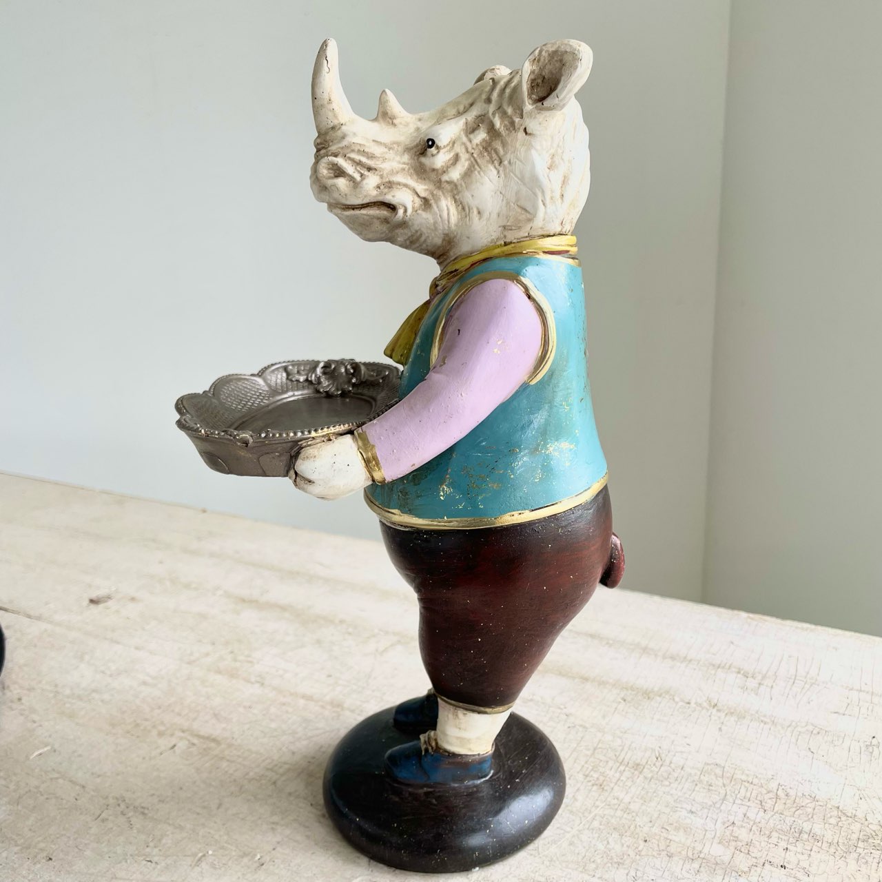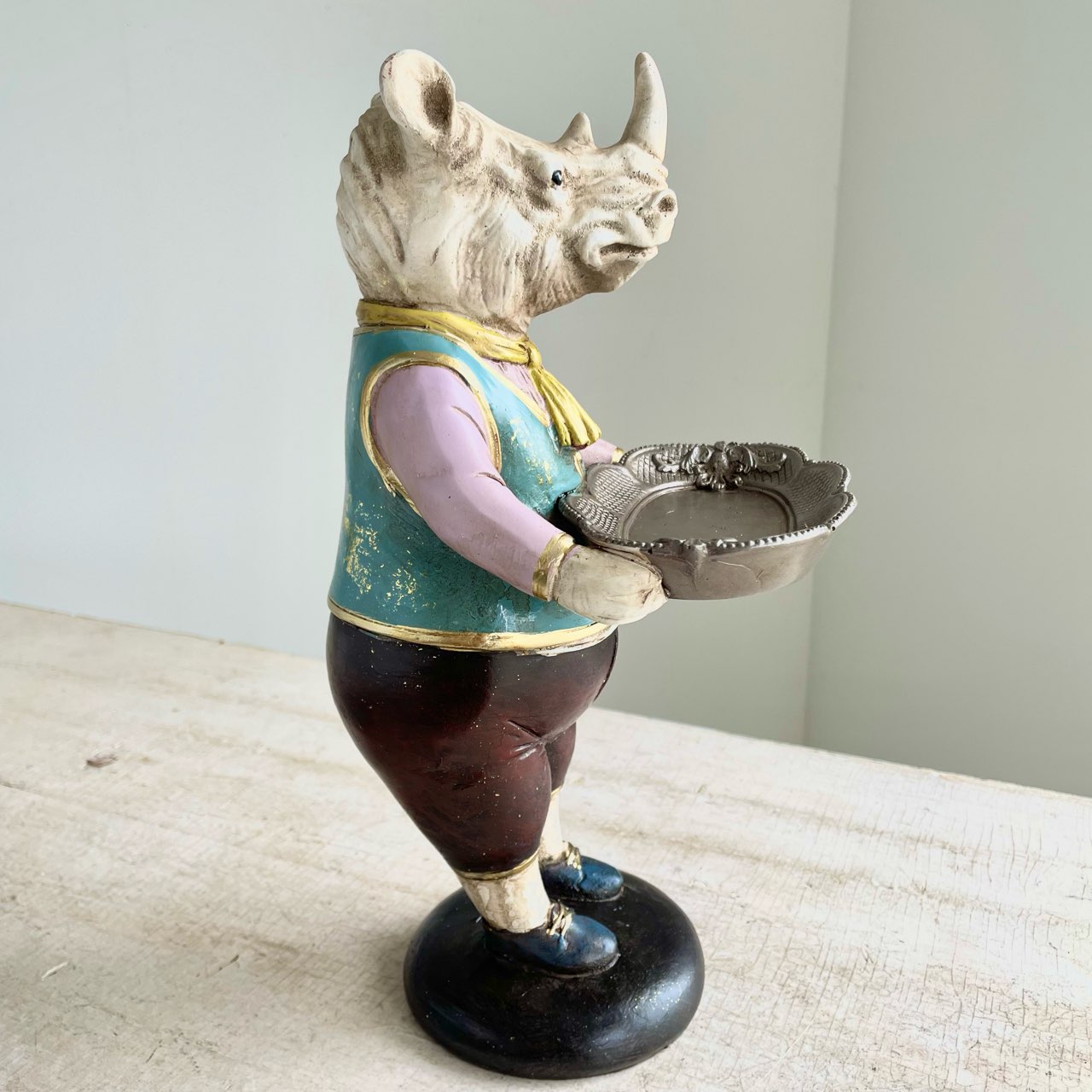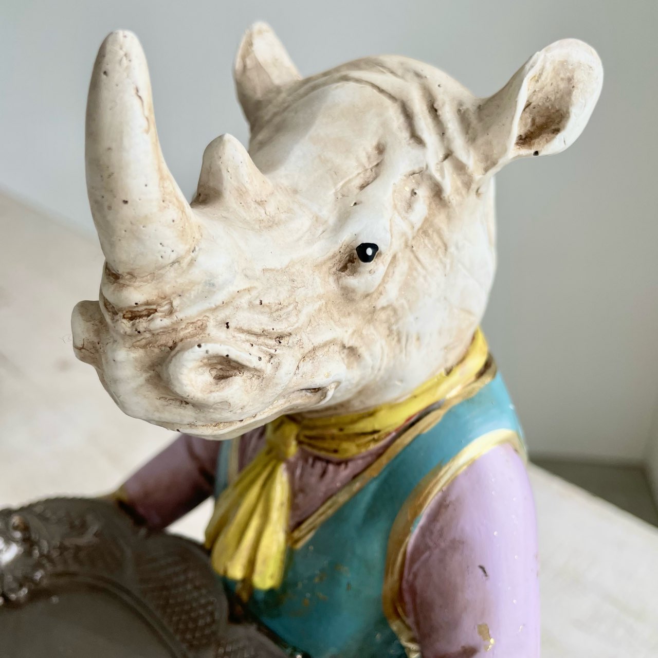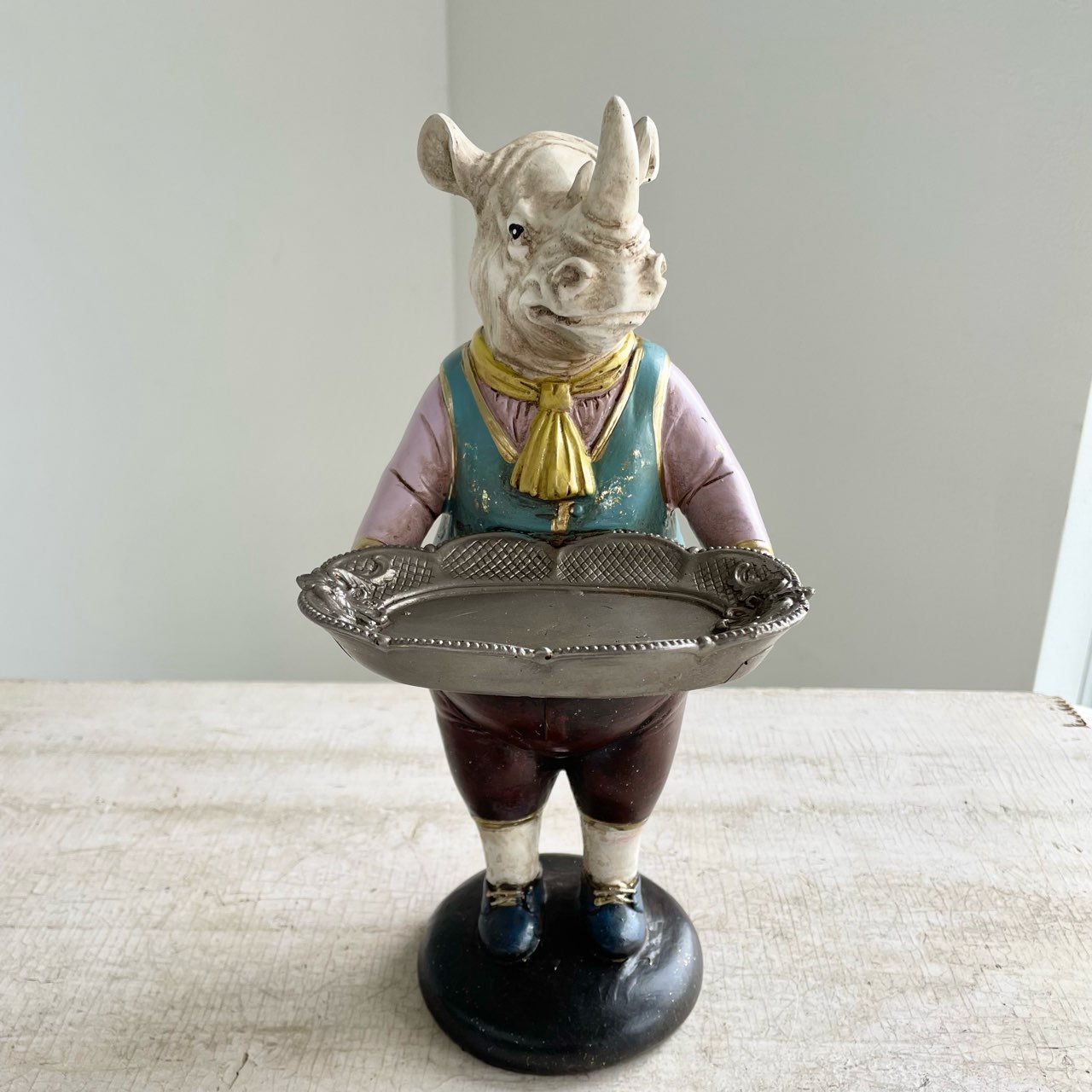 クラシカルな装いのサイ紳士が、トレイを抱えてお出迎え。