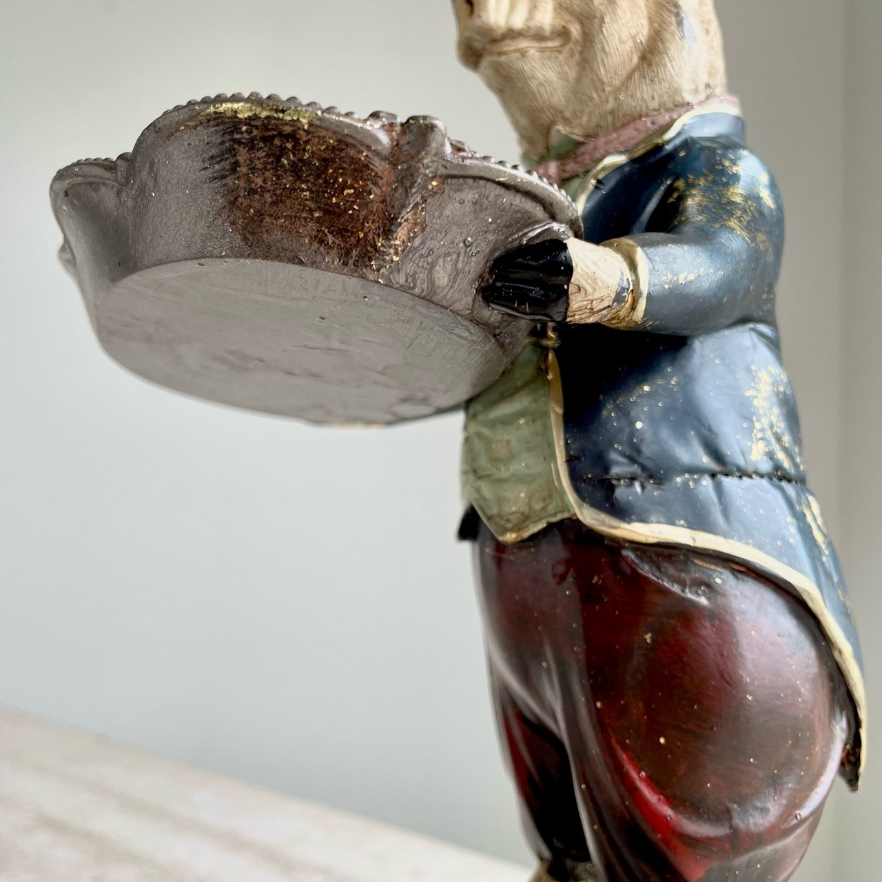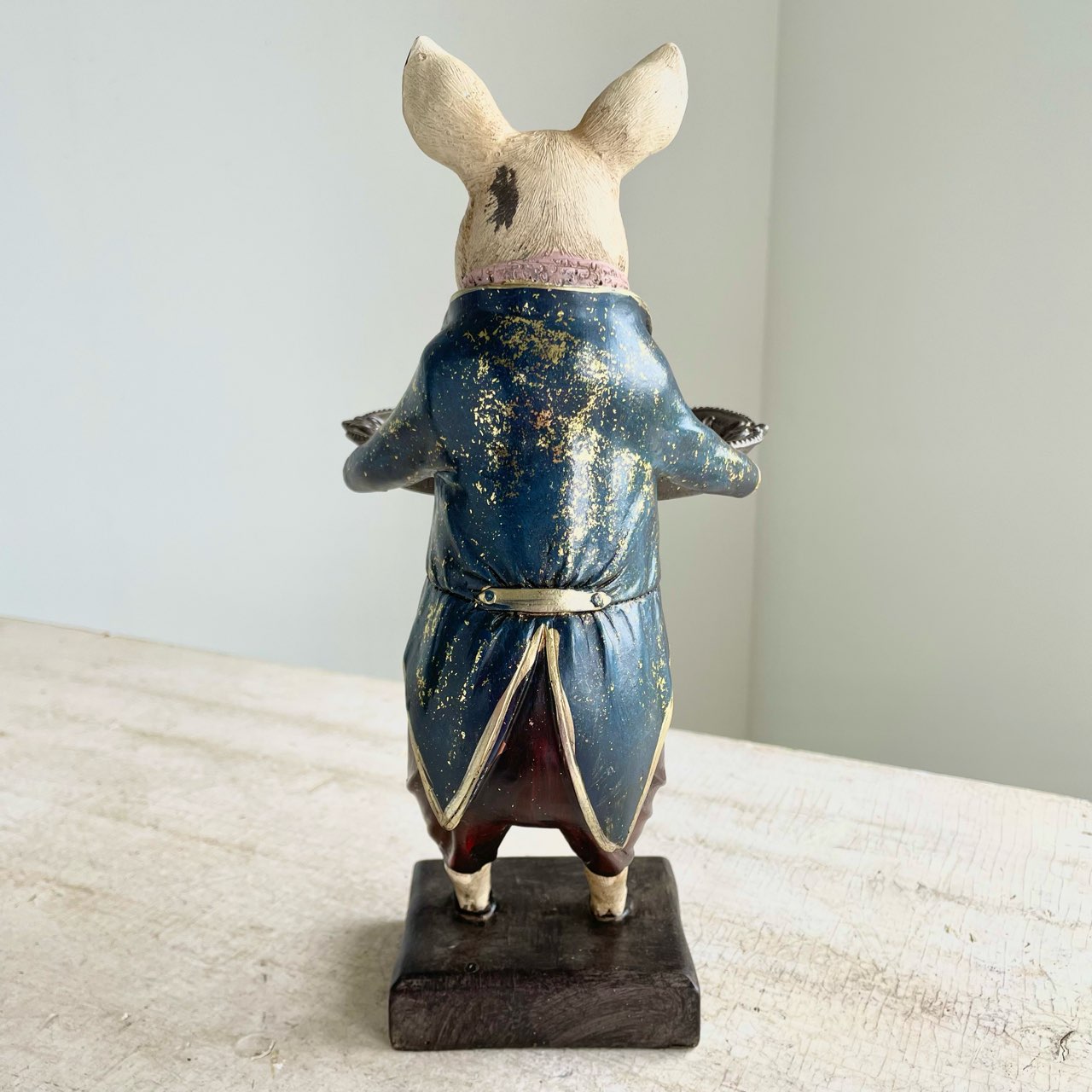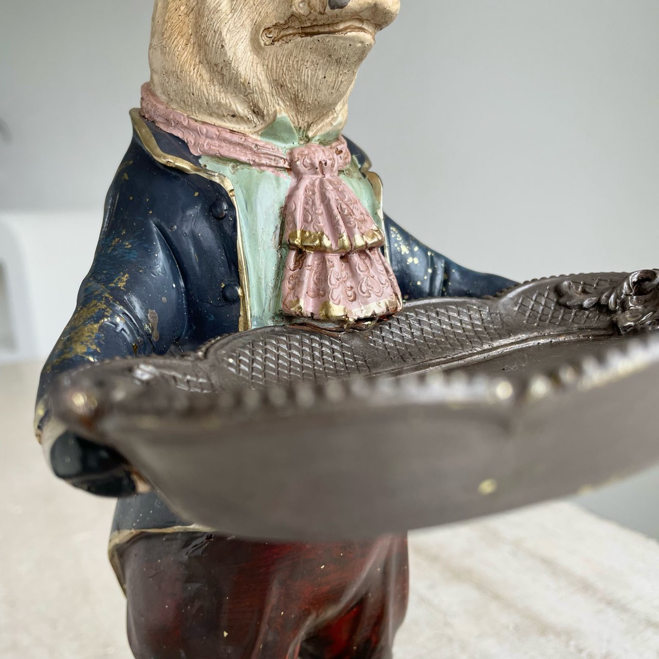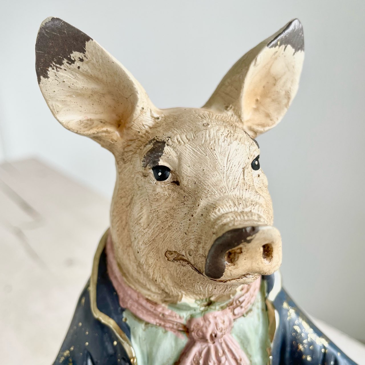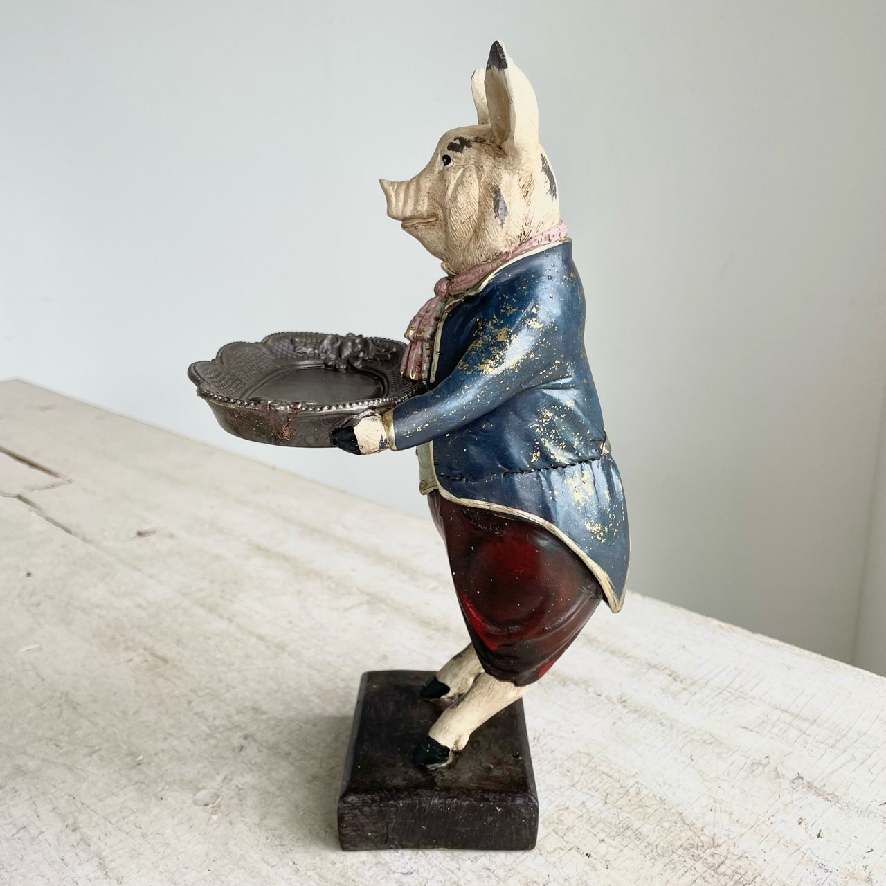 クラシカルな衣装をまとったブタの紳士が、トレイを持ってお出迎え。