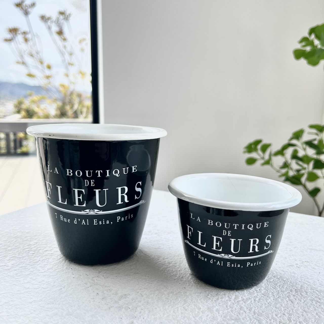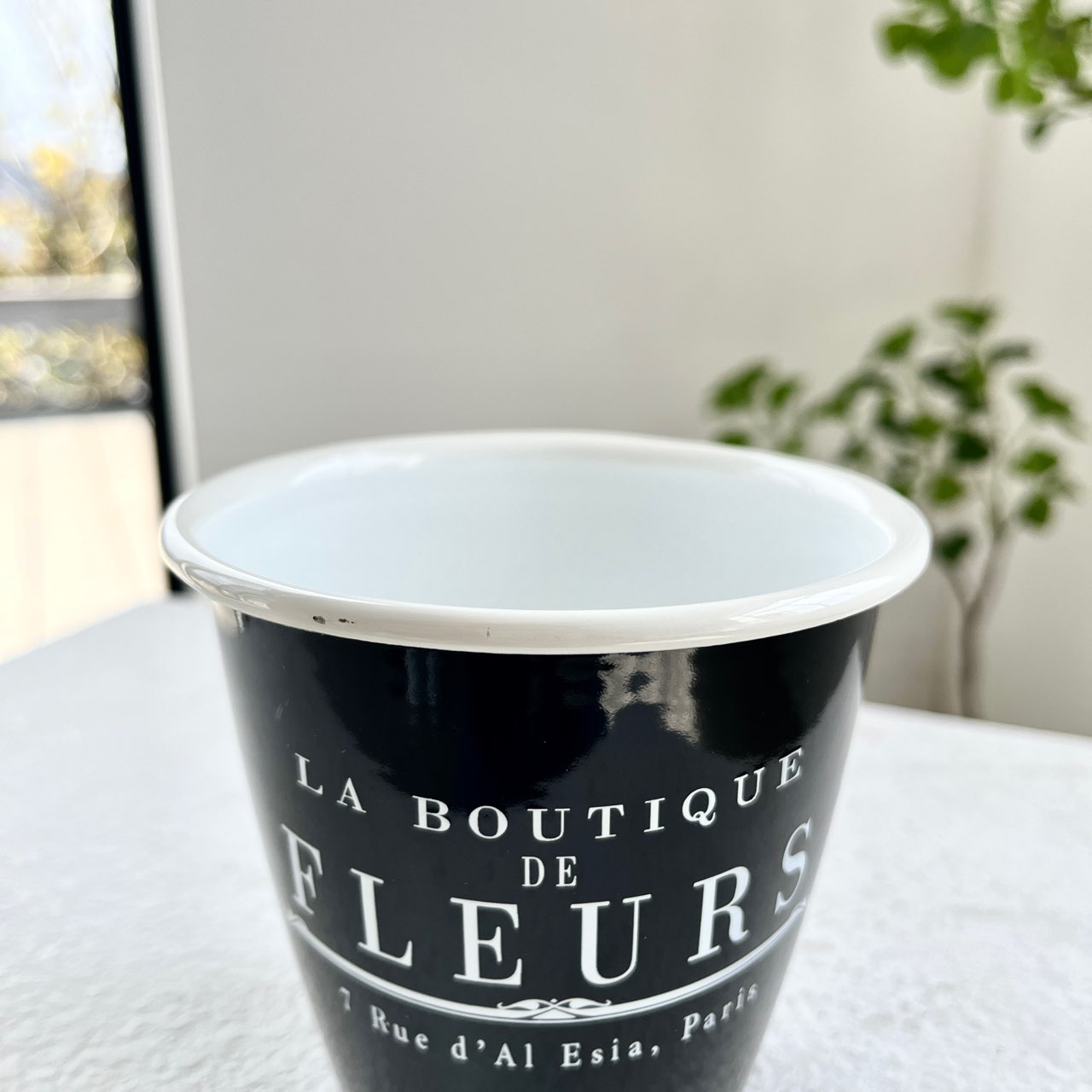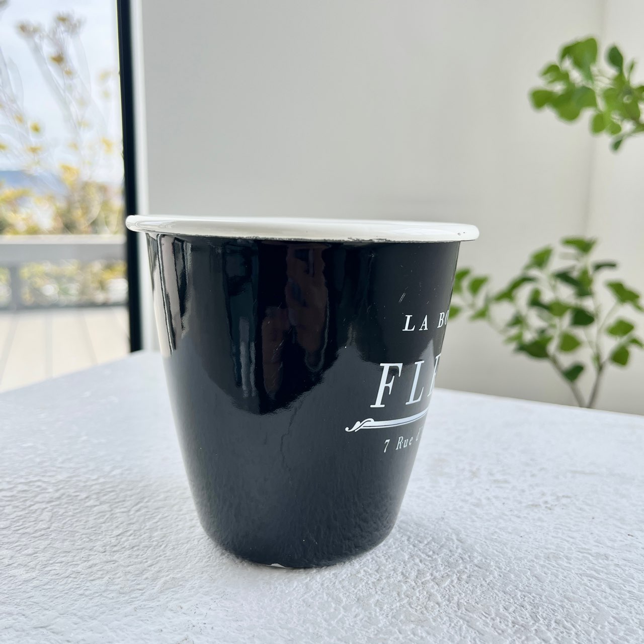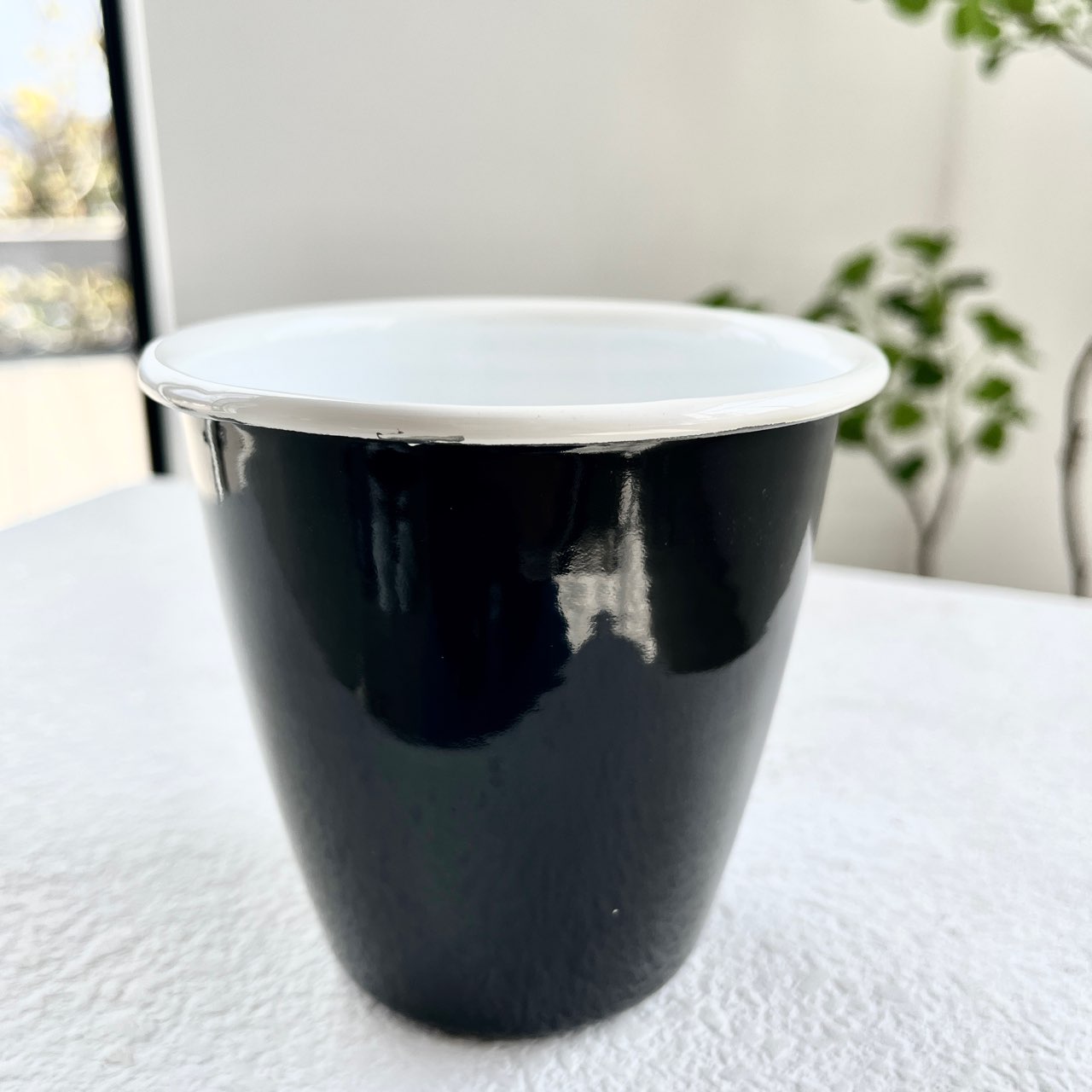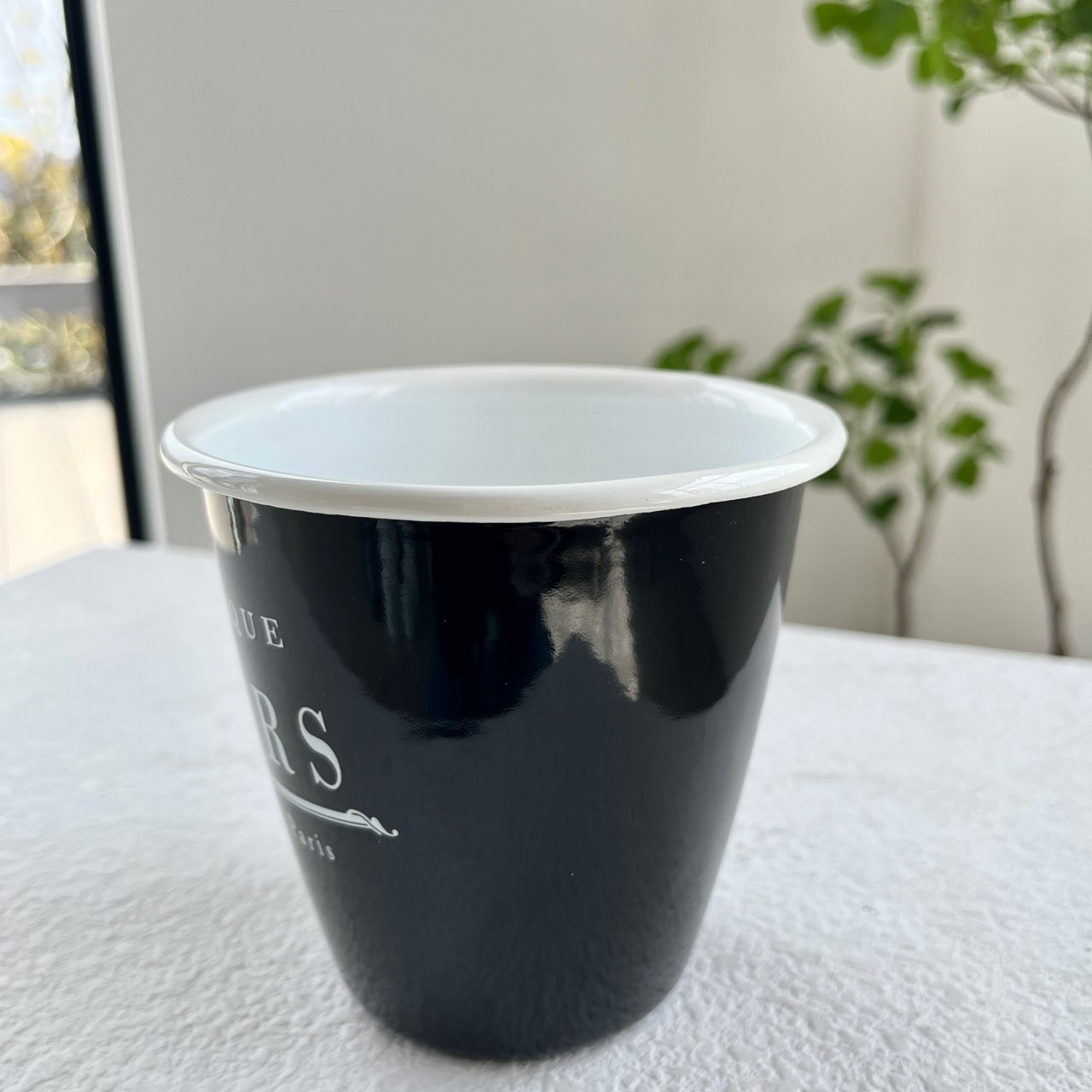 シックなデザインが魅力の、ホーロー仕上げのカップ。