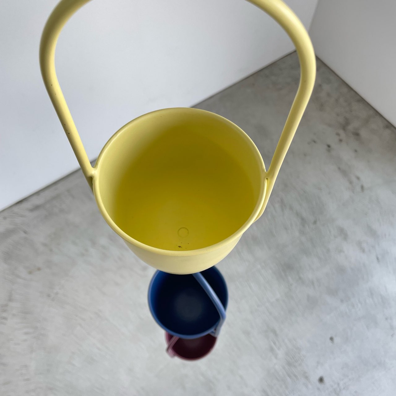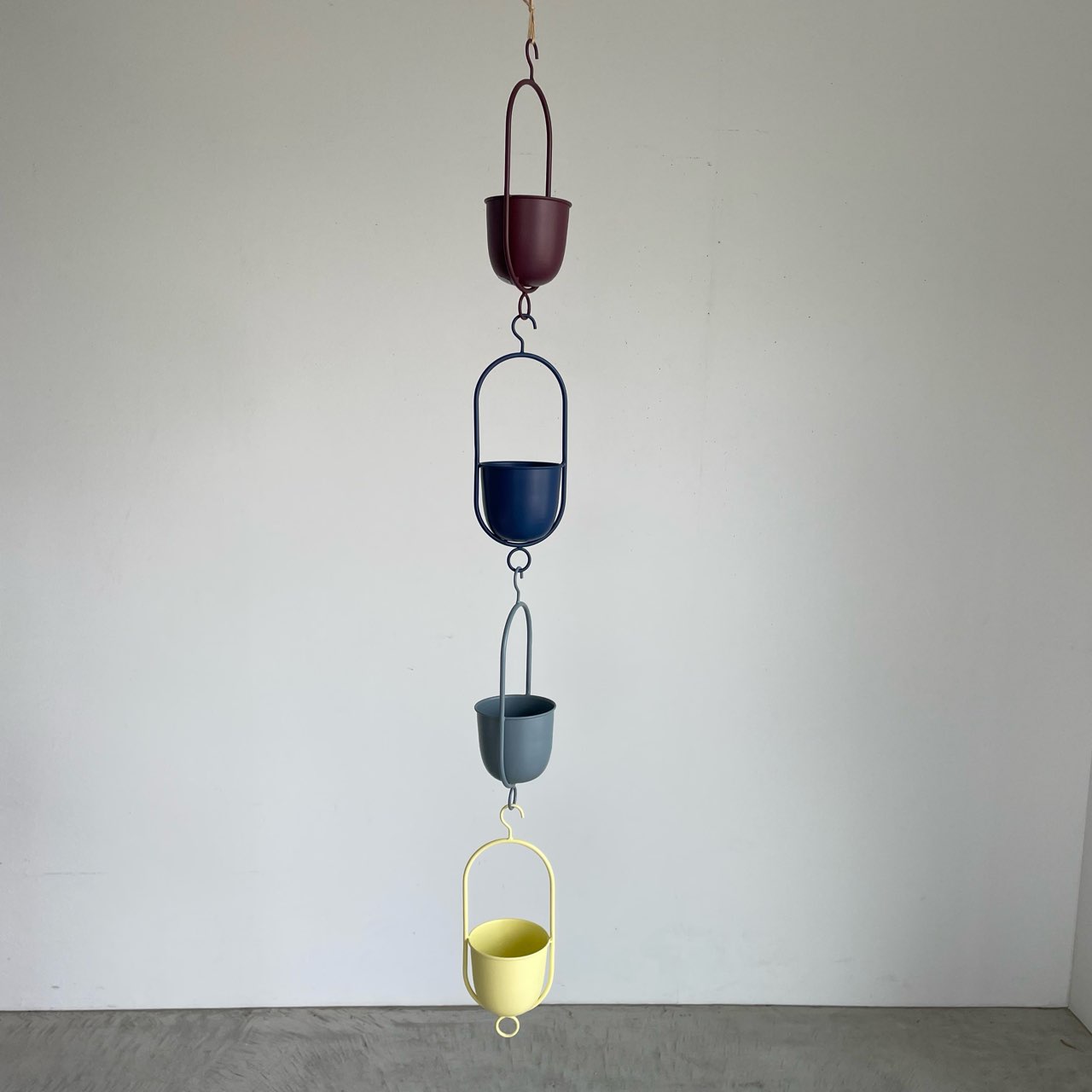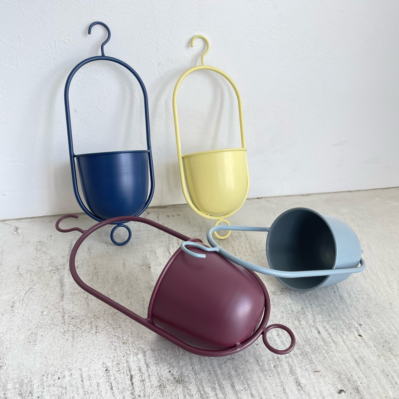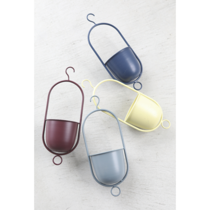 ネイビー、イエロー、グレー、ボルドーの4色展開、コンパクトなハンギングポットセット。