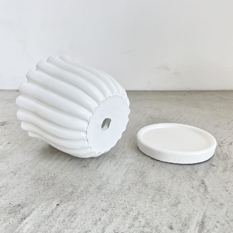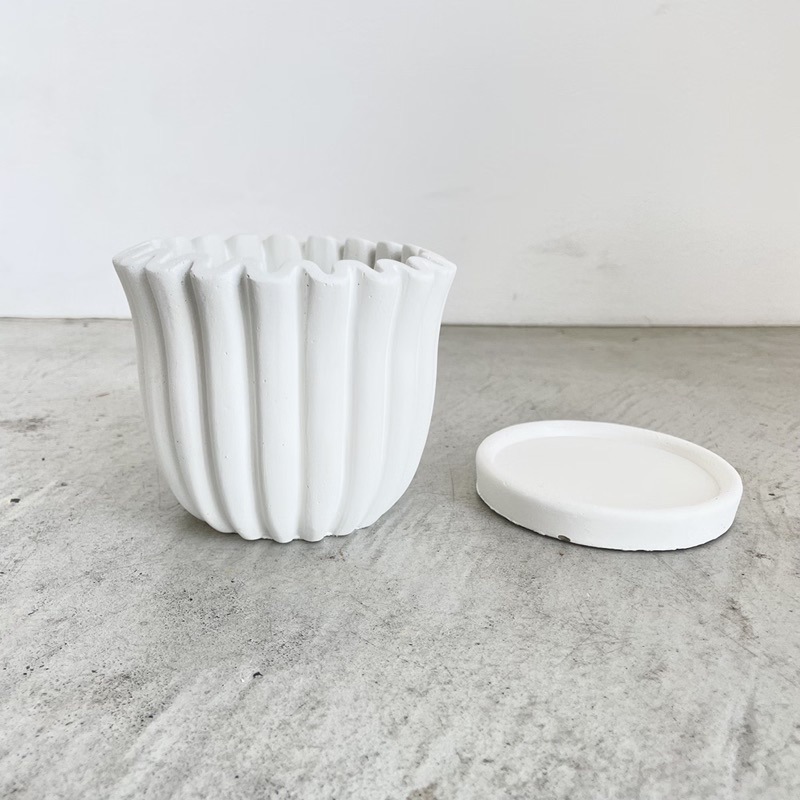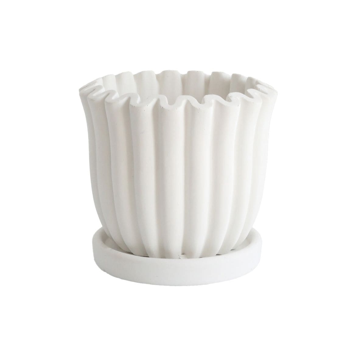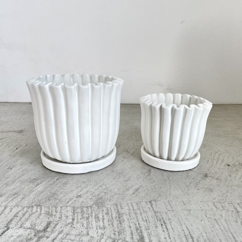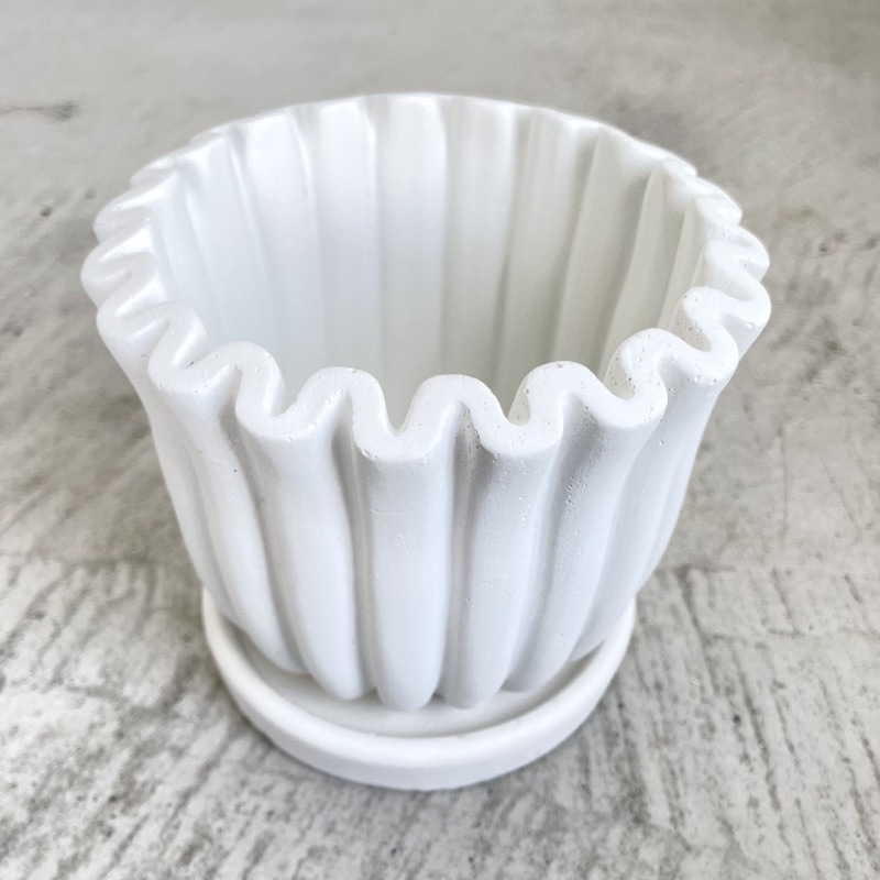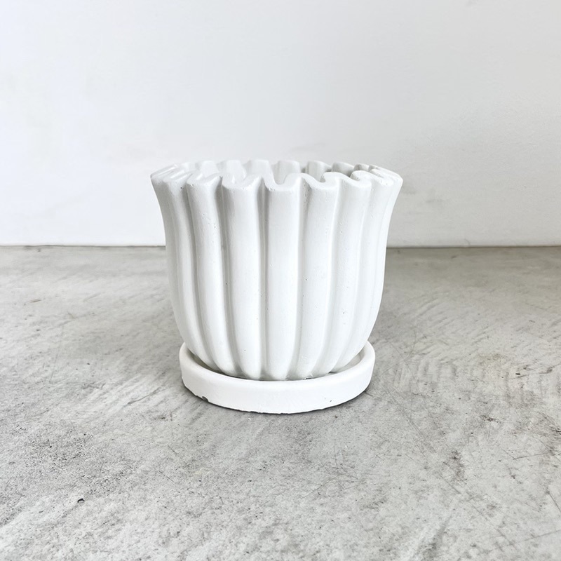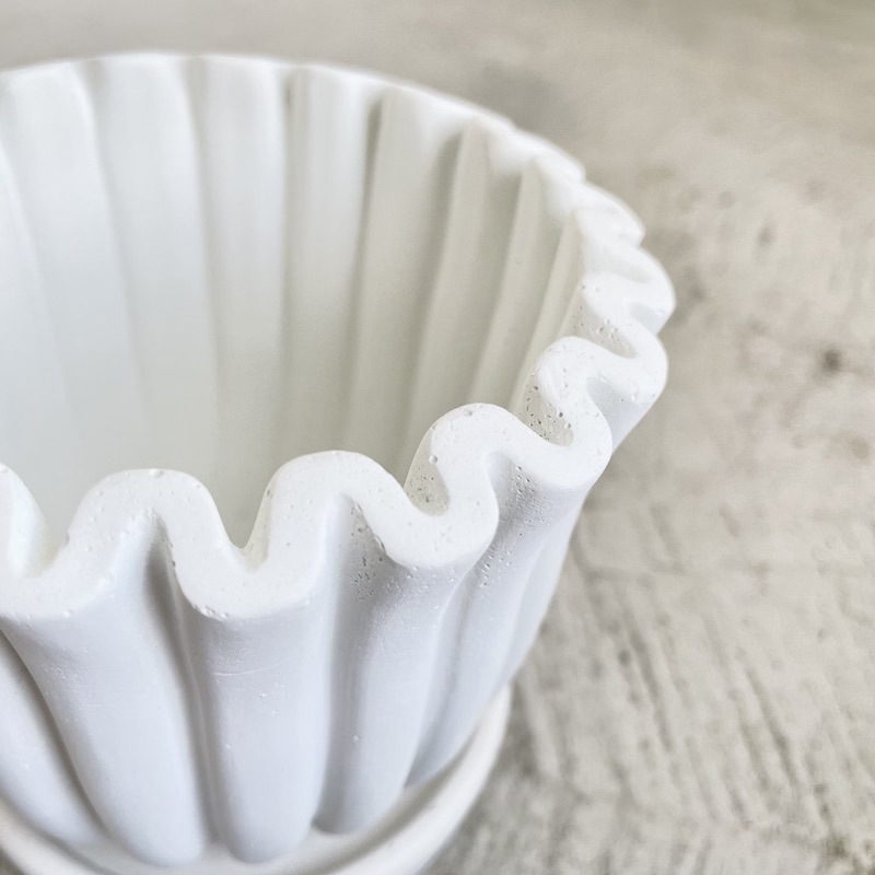 フリルのように柔らかく波打つ縁取りと、クラシカルな縦ラインが魅力の陶器鉢カバー。 マットなホワイトカラーが植物の色を引き立て、どんなインテリアにもなじむナチュラルな存在感を放ちます。 アンティーク風の家具や、シャビーシックな空間、韓国インテリアとの相性も抜群。 小ぶりな観葉植物や多肉植物、ドライフラワーのアレンジにもぴったりです。 受け皿付きで、実用性とデザイン性を両立したアイテムです。
