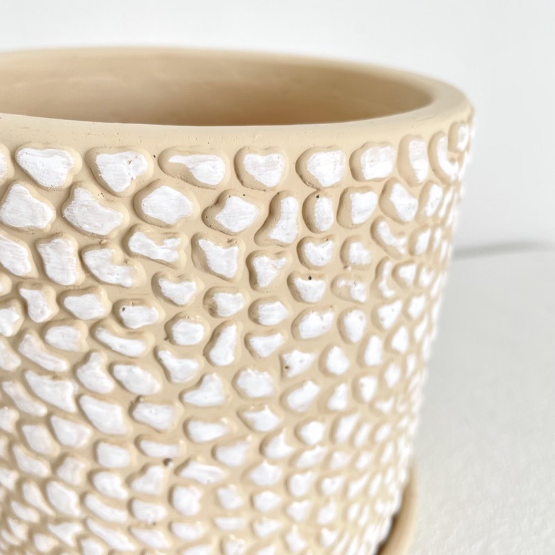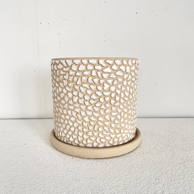 温かみのあるベージュのベースに、無数の小石が敷き詰められたかのような立体的な模様が施されています。