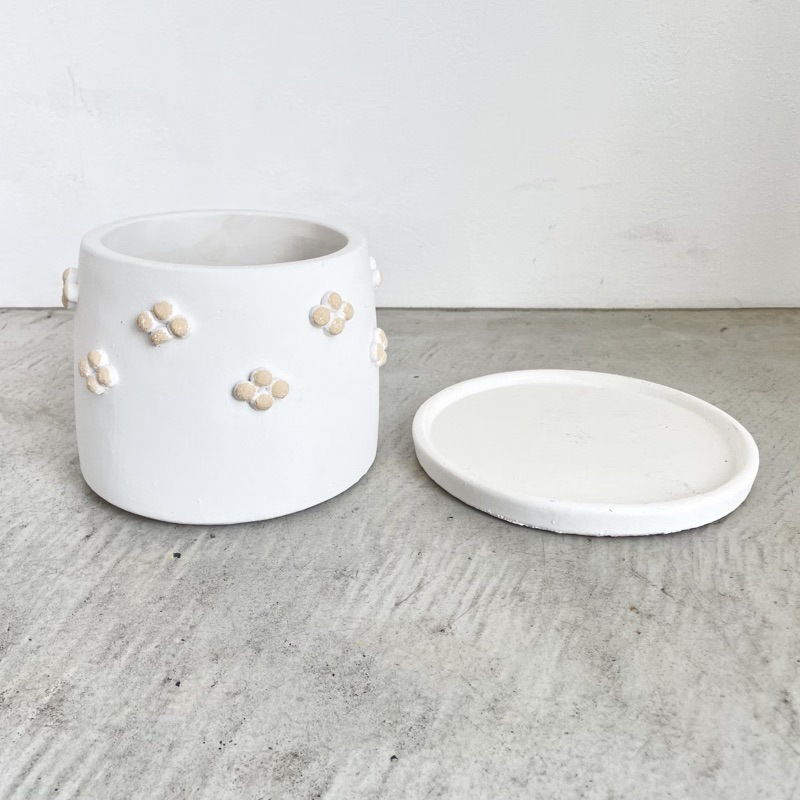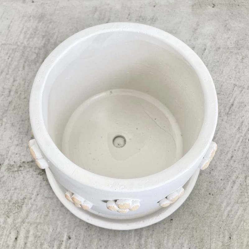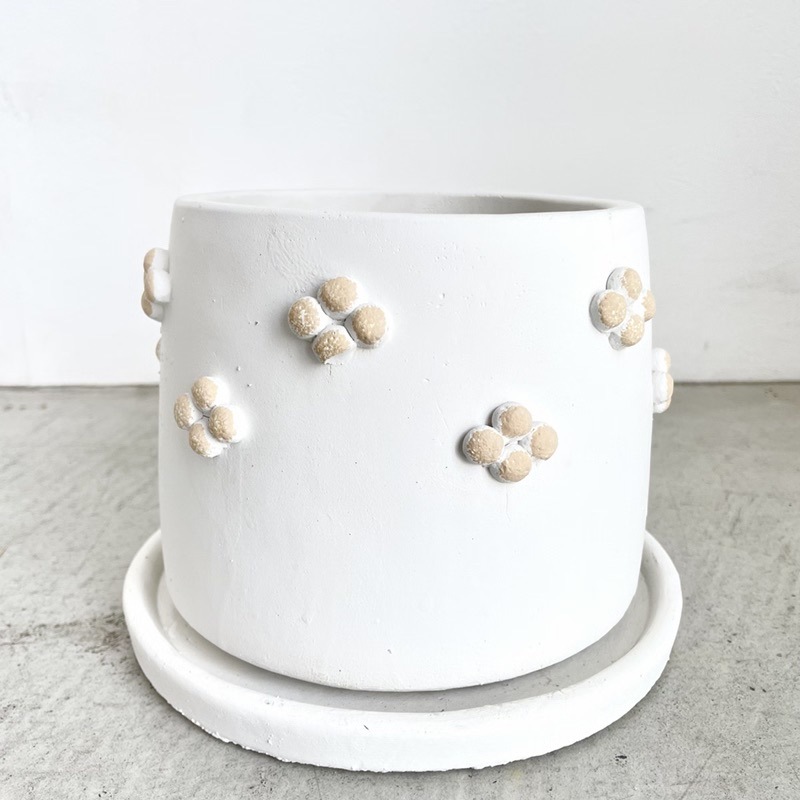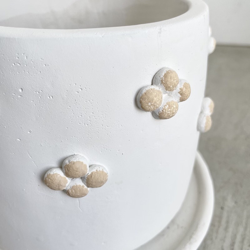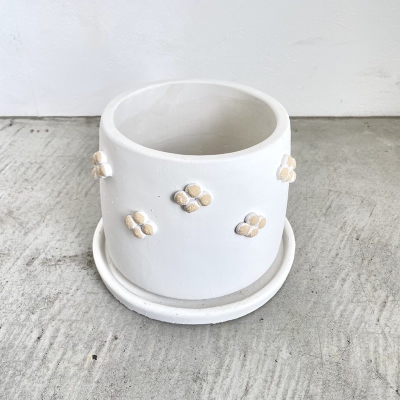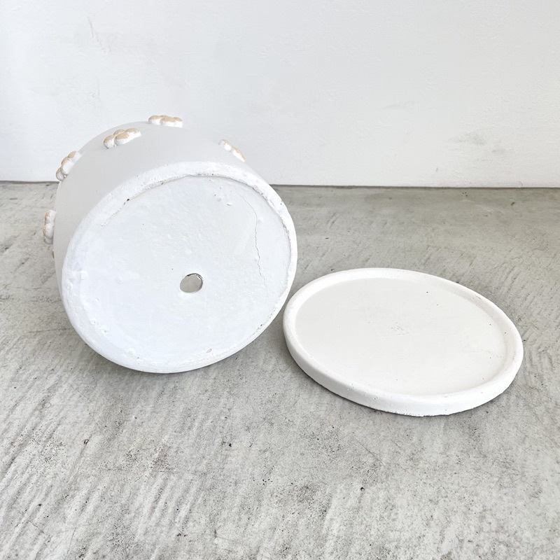 マットなホワイトのボディに、同系色の小さな花々がエンボス加工で散りばめられています。