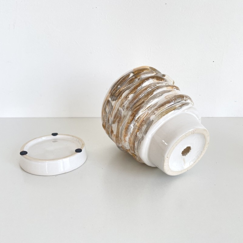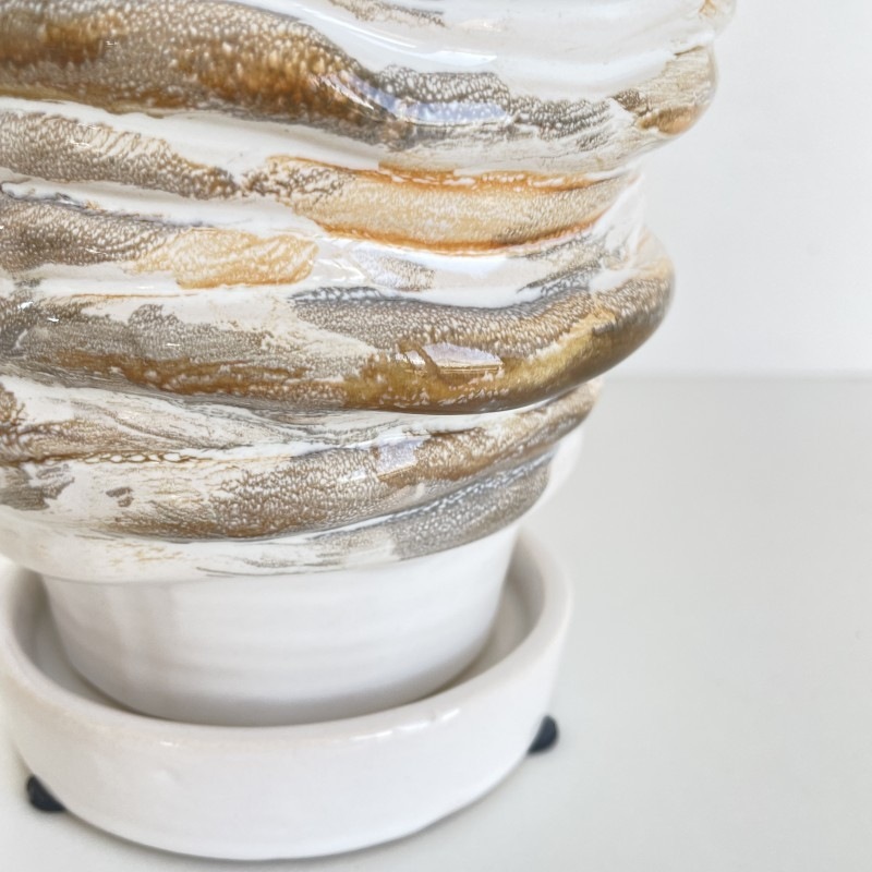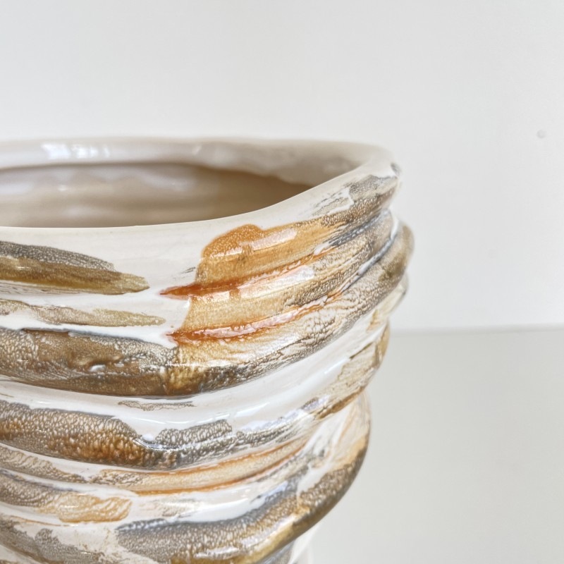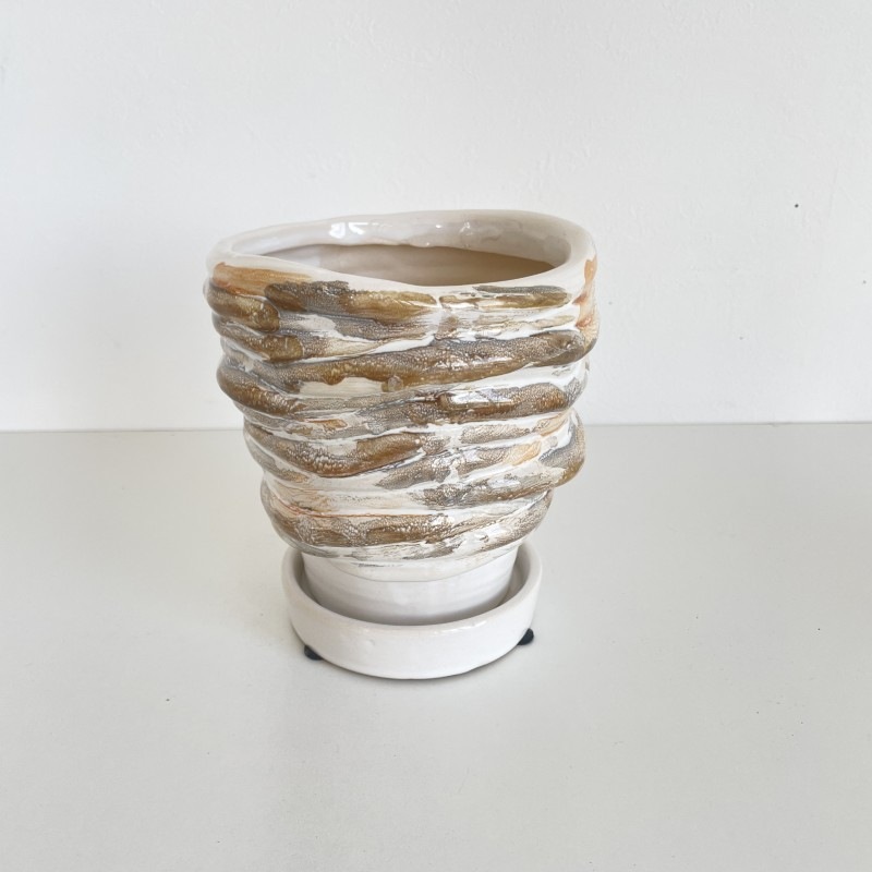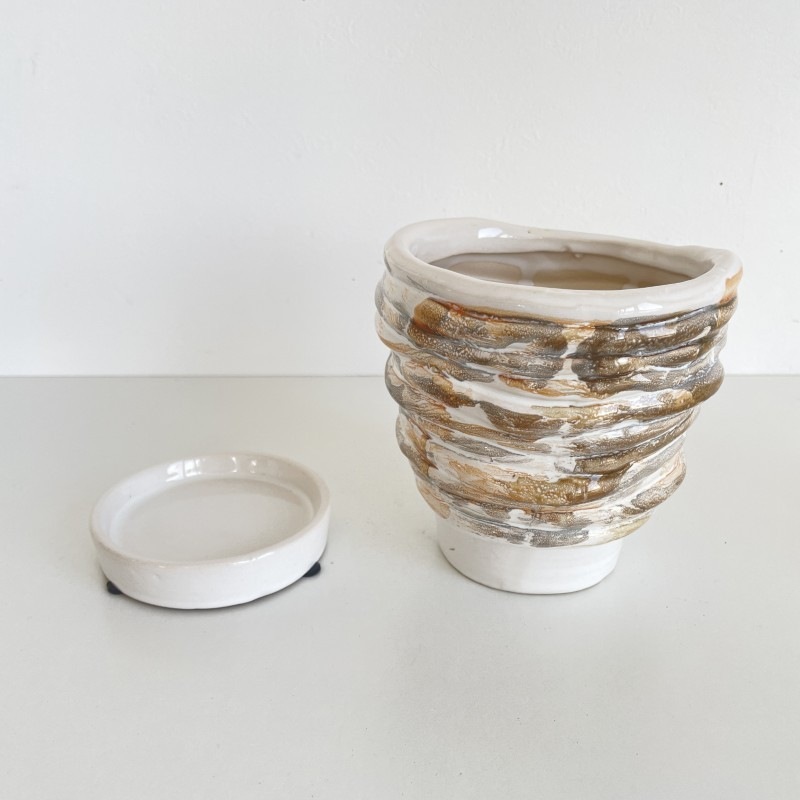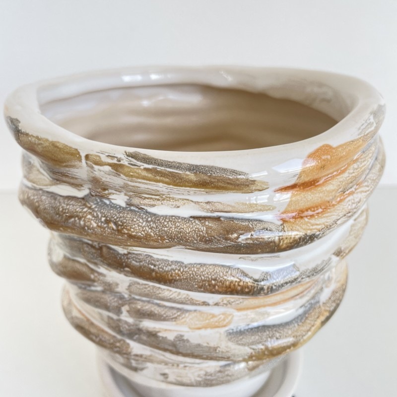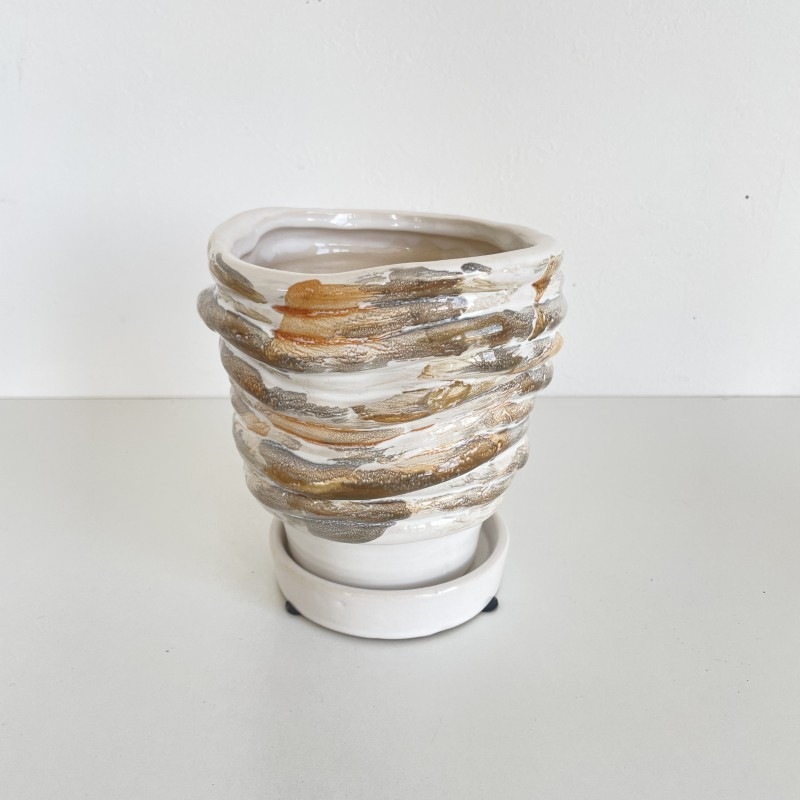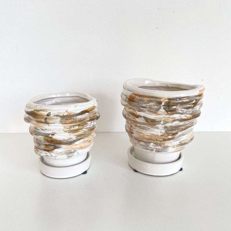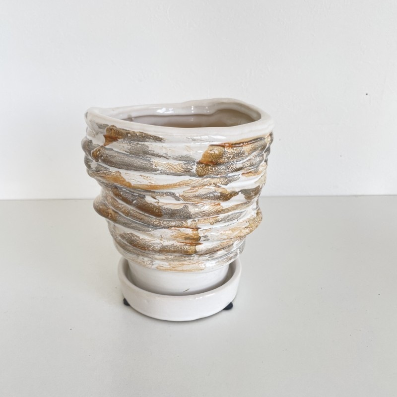 柔らかい印象のホワイトを基調に、ベージュやグレーのニュアンスカラーでマーブル模様が施された陶器製フラワーポットです。