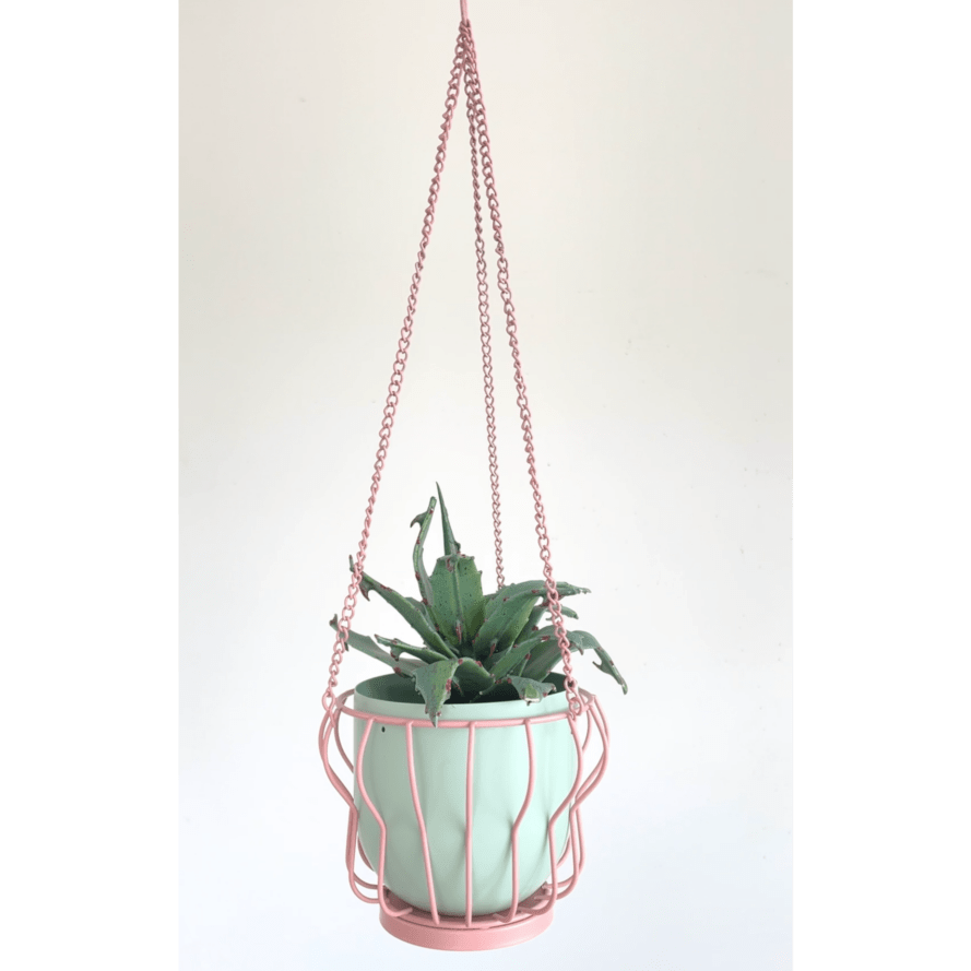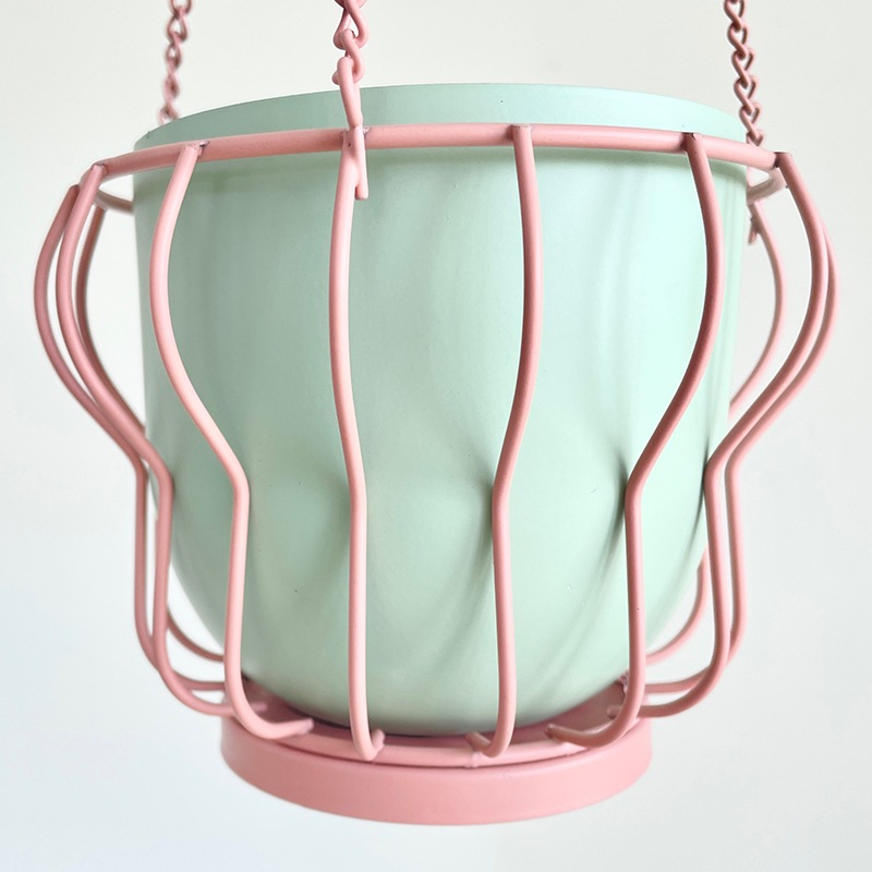 モダンで軽やかなデザインが魅力の、ワイヤーケージ付きハンギングフラワーポットです。