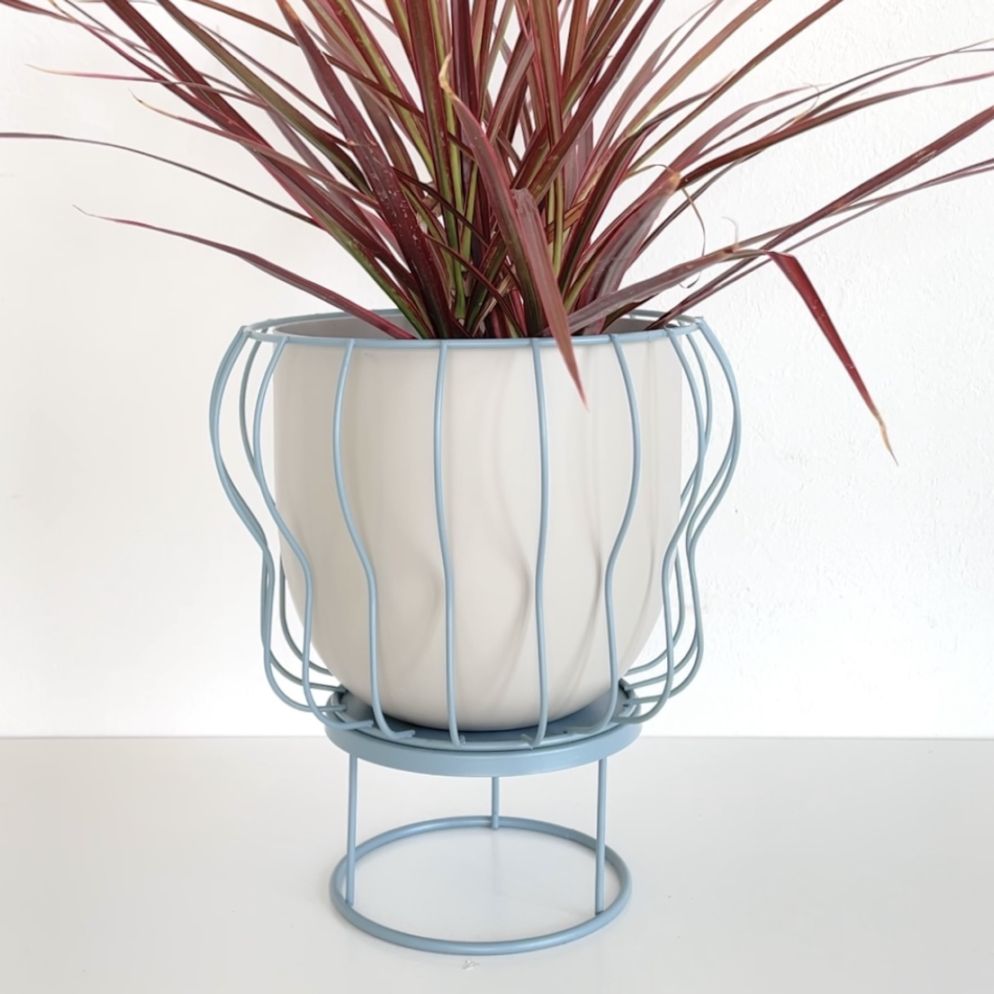 軽快なワイヤーケージと、丸みのあるポットを組み合わせたスタンドタイプのフラワーポットです。
