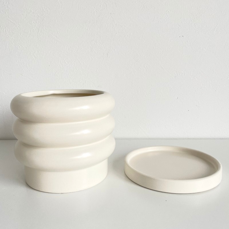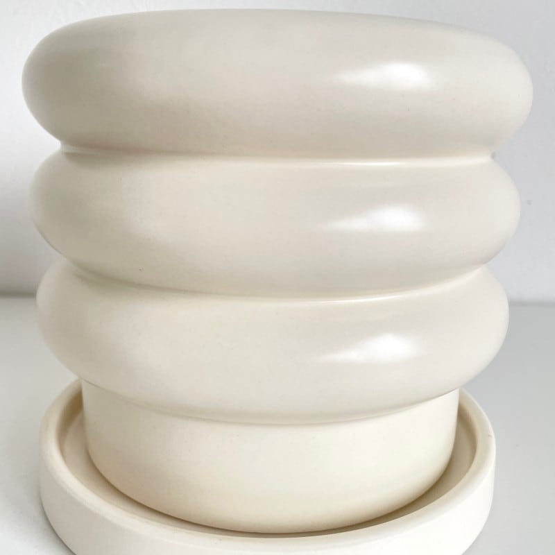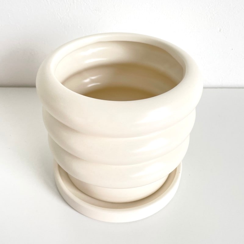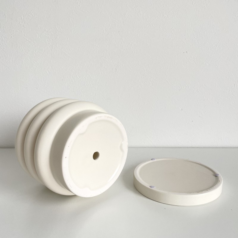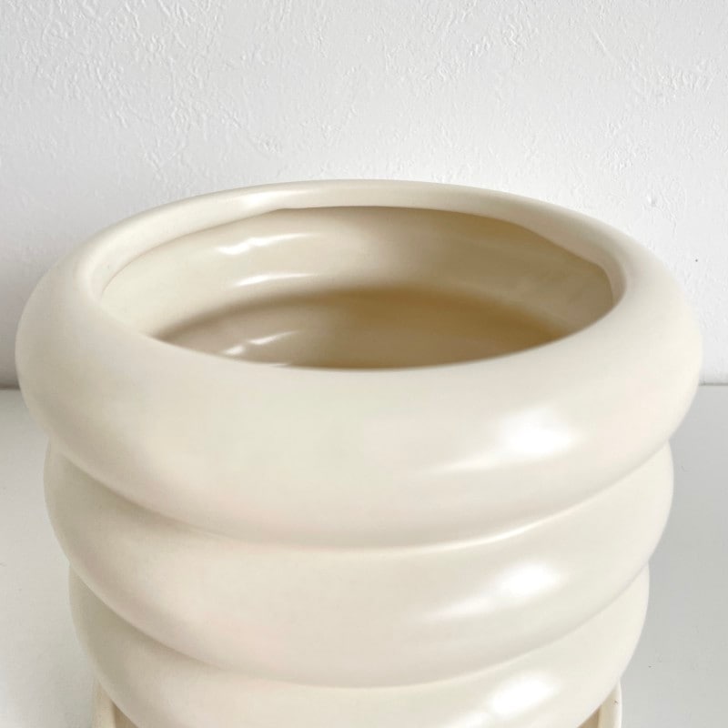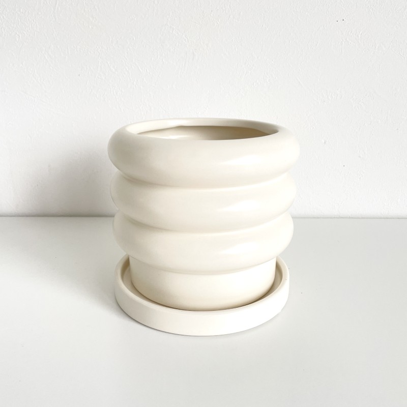 滑らかなホワイトの質感と、段々になった有機的なフォルムが、植物を優しく包み込みます。