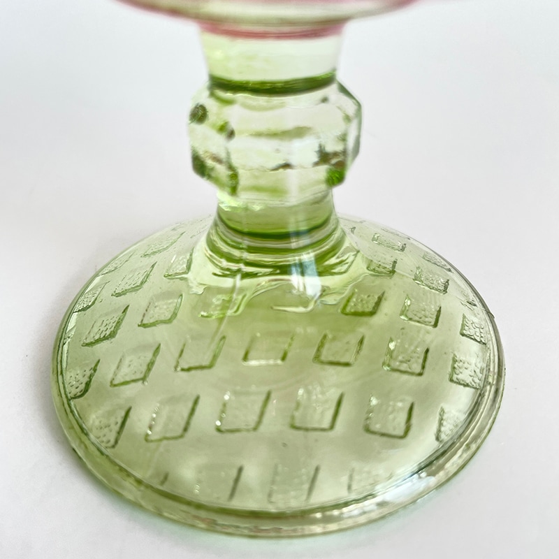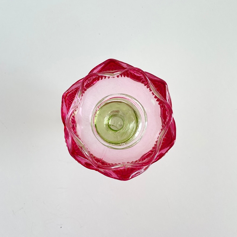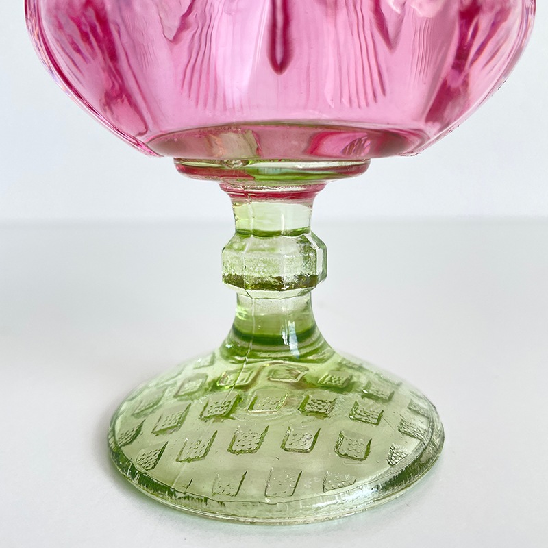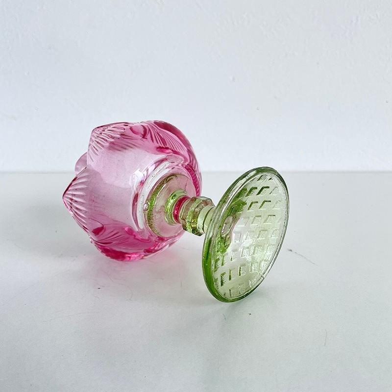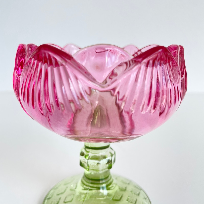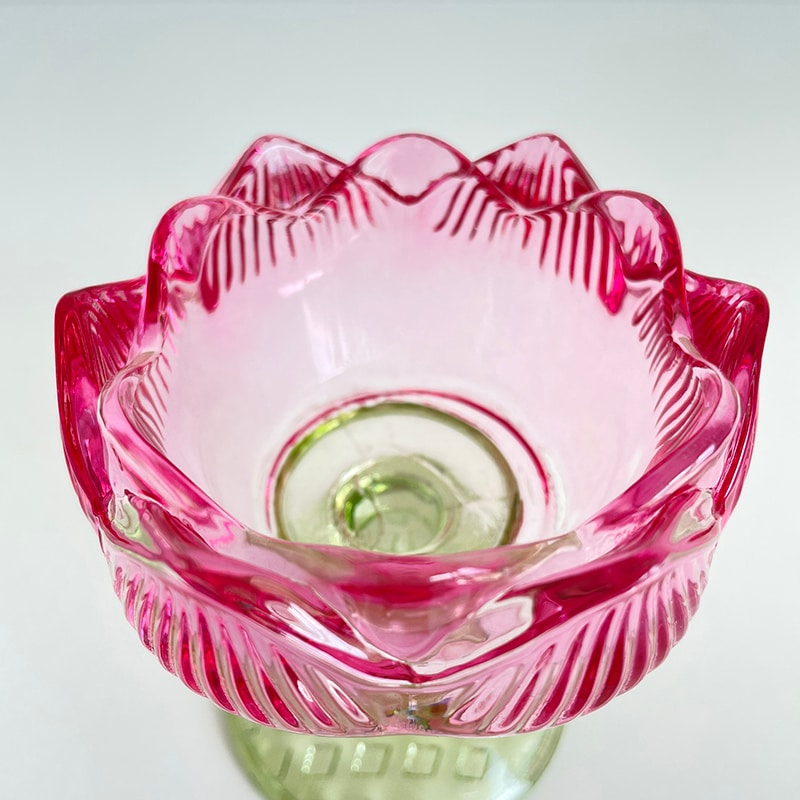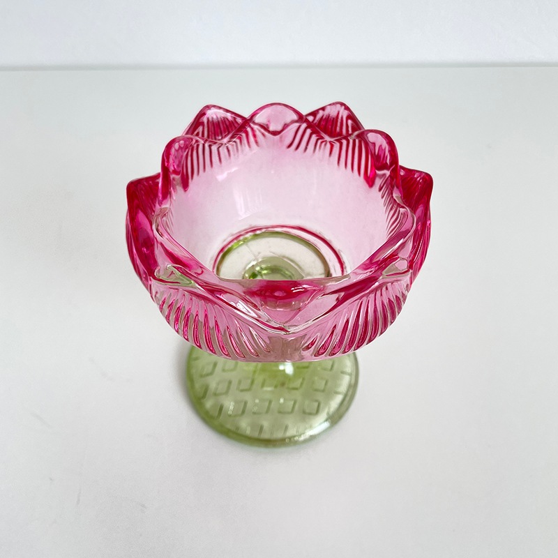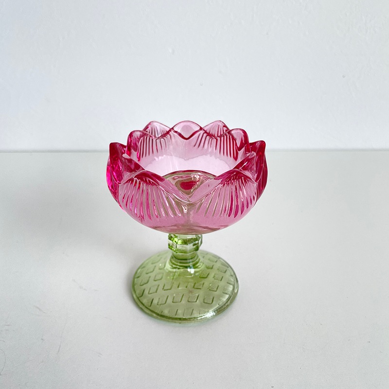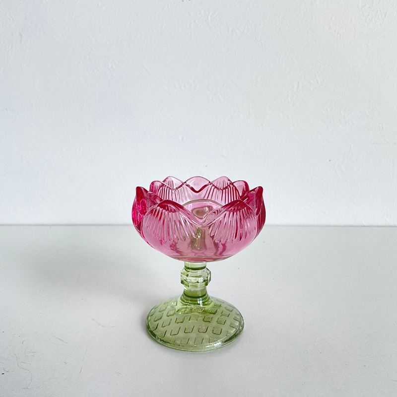 鮮やかな色ガラスの、ハスの花を思わせるレトロで愛らしいフォルムが魅力の脚付きカップ。