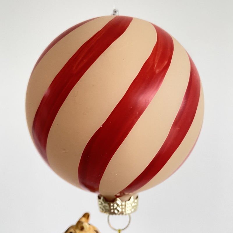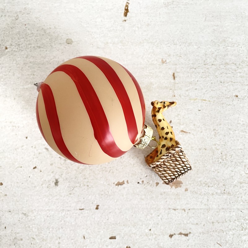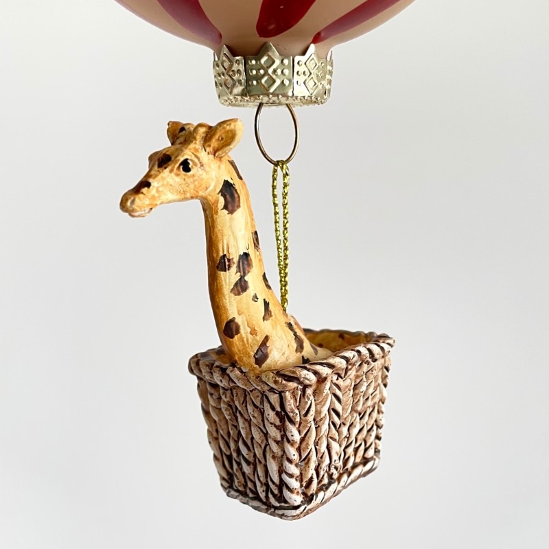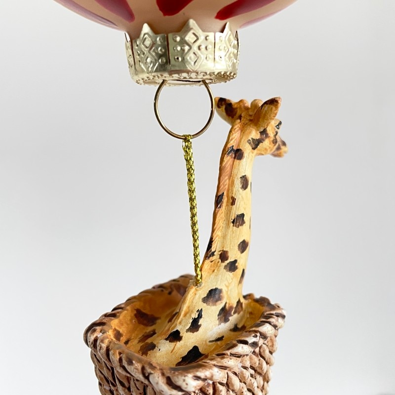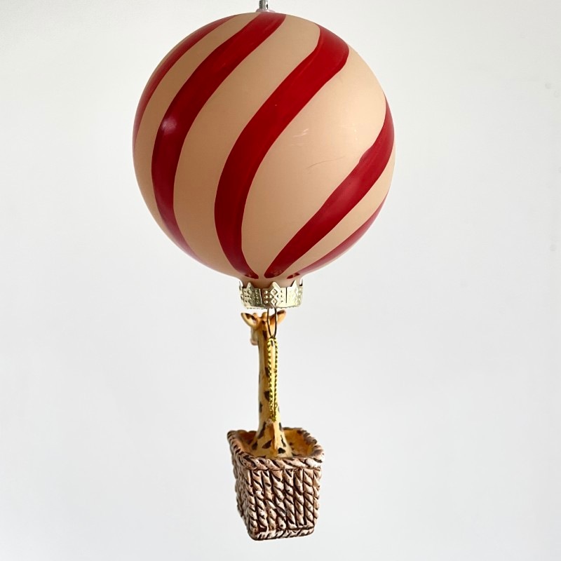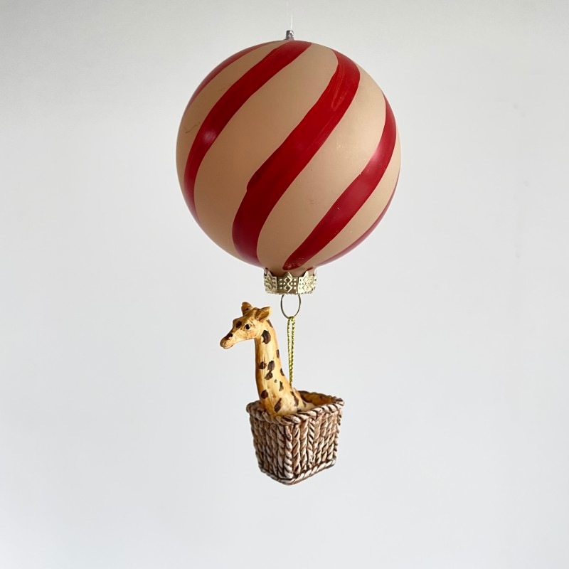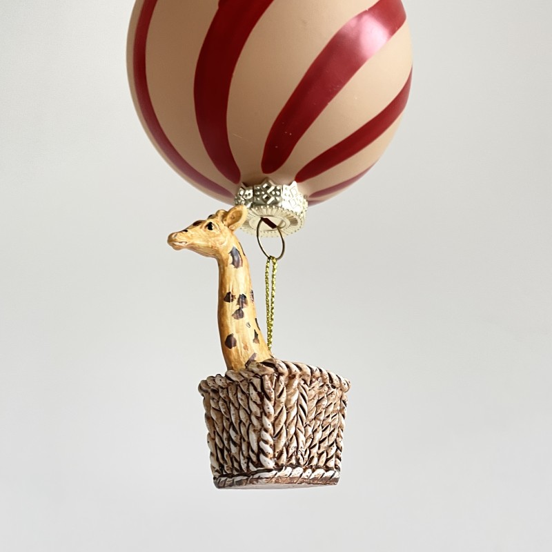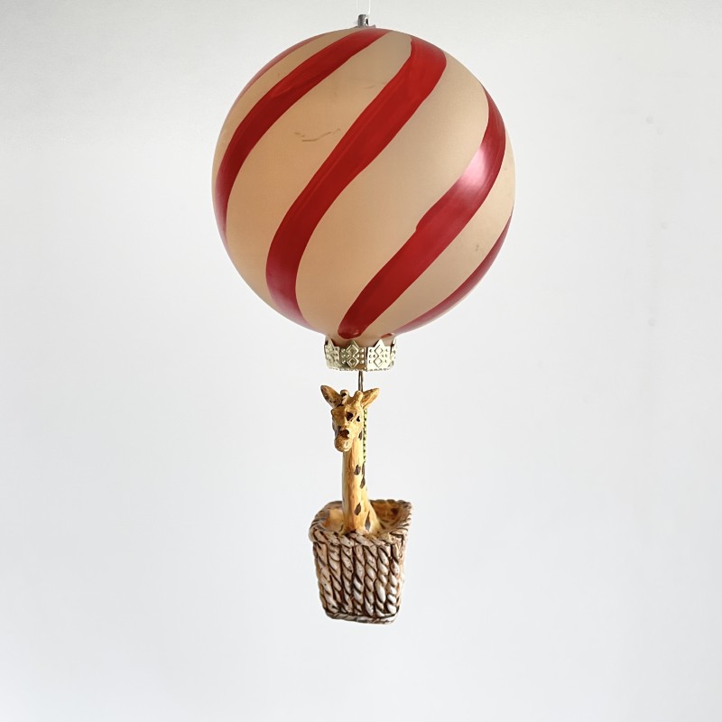 ノスタルジックな赤とベージュのストライプの気球に、キリンのフィギュアがバスケットから顔を出した、遊び心溢れるオーナメント。