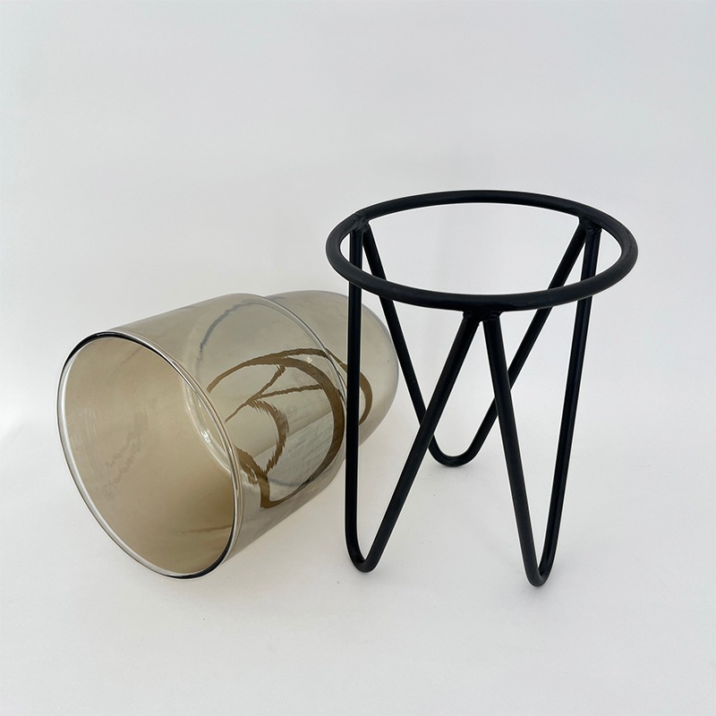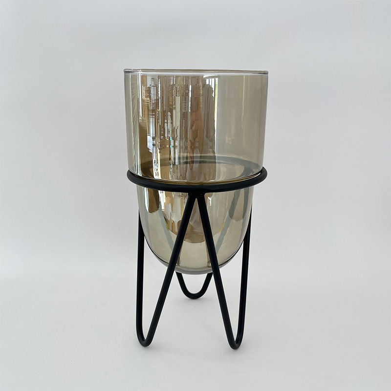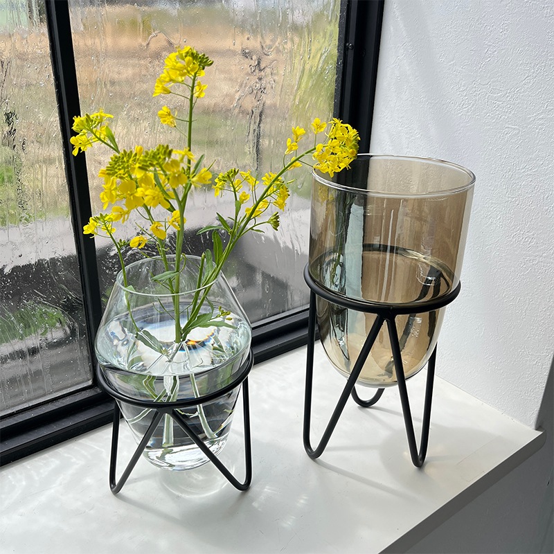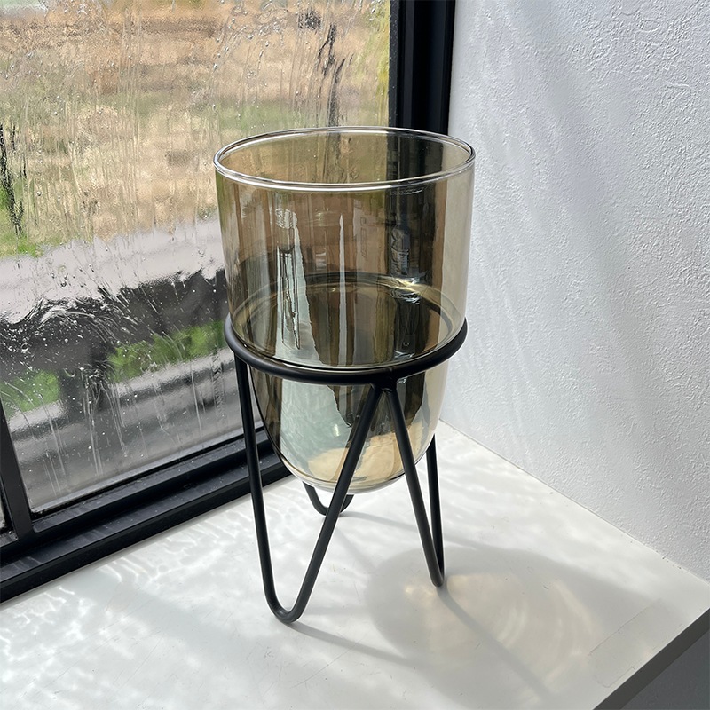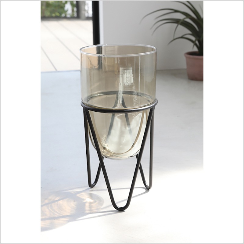 クリアガラスの透明感とブラックアイアンのスタンドが絶妙なバランスを生み出し、空間にモダンなアクセントを加えます。