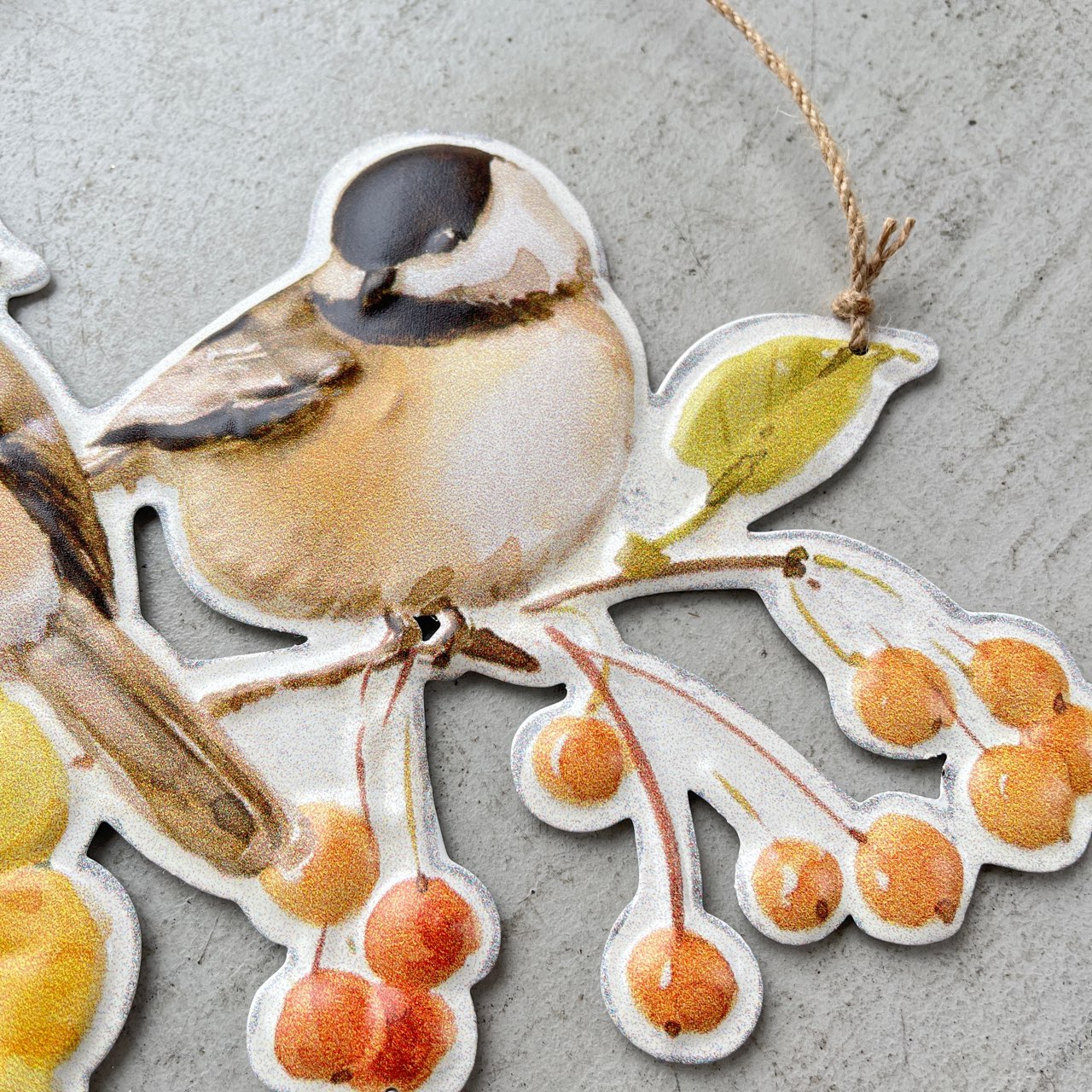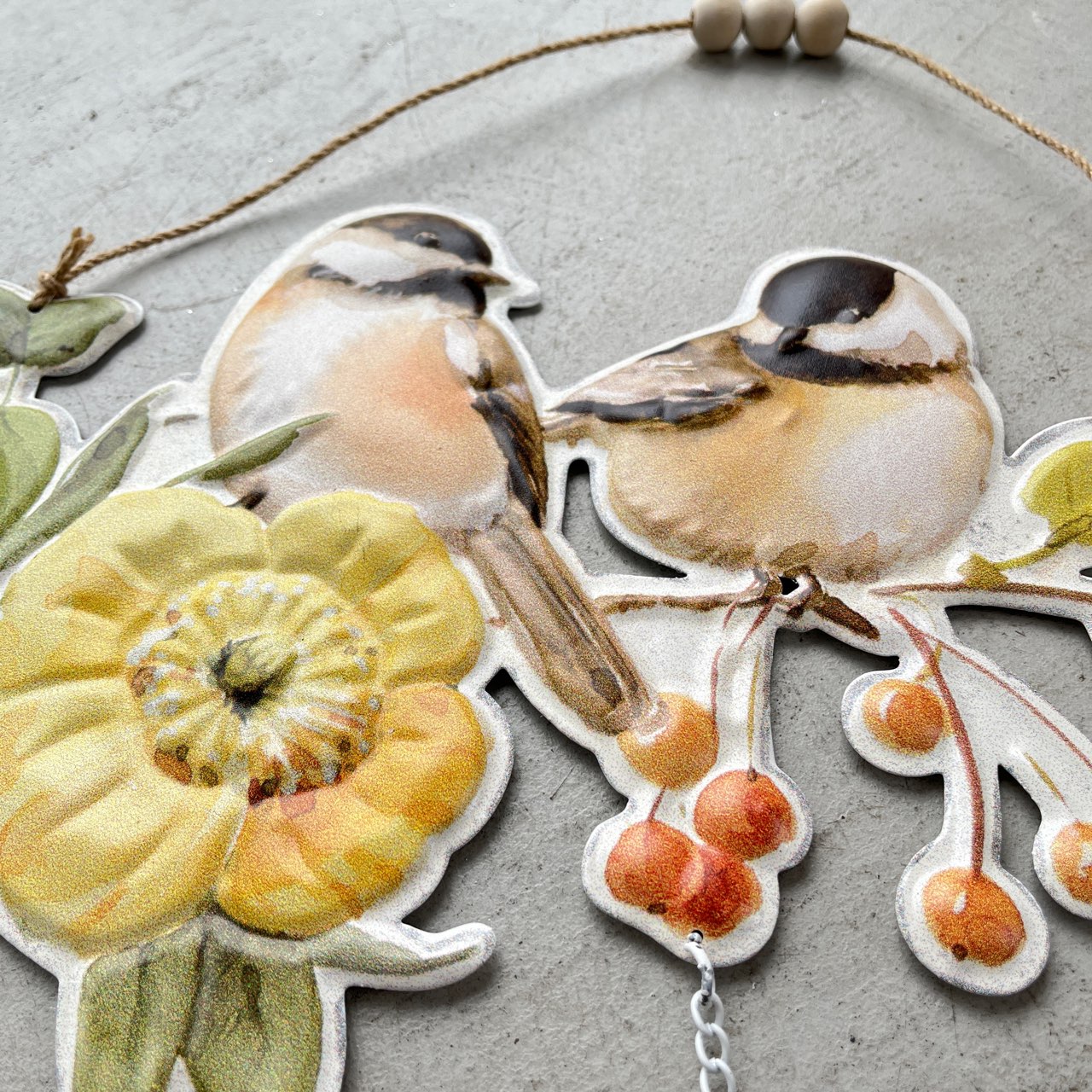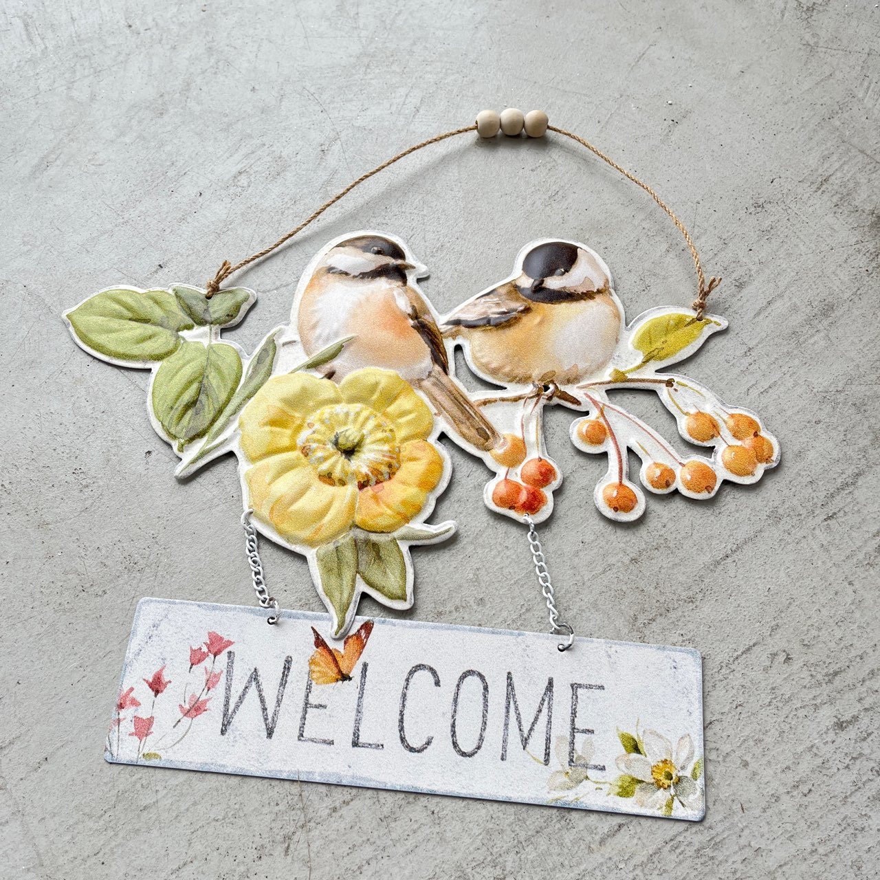 ふっくらとした小鳥たちと彩り豊かな花々が描かれた、やさしい雰囲気のウェルカムプレート。