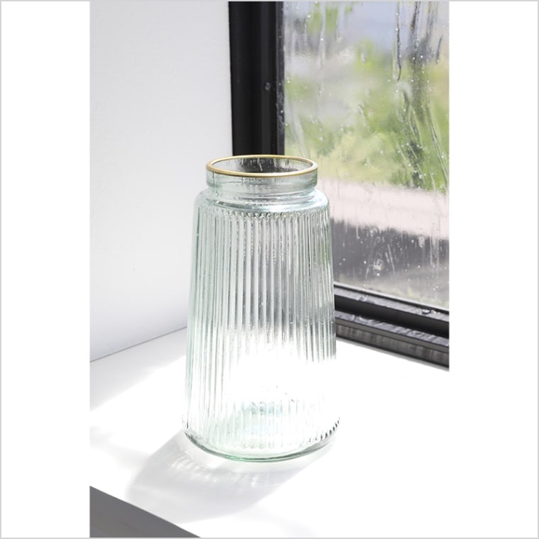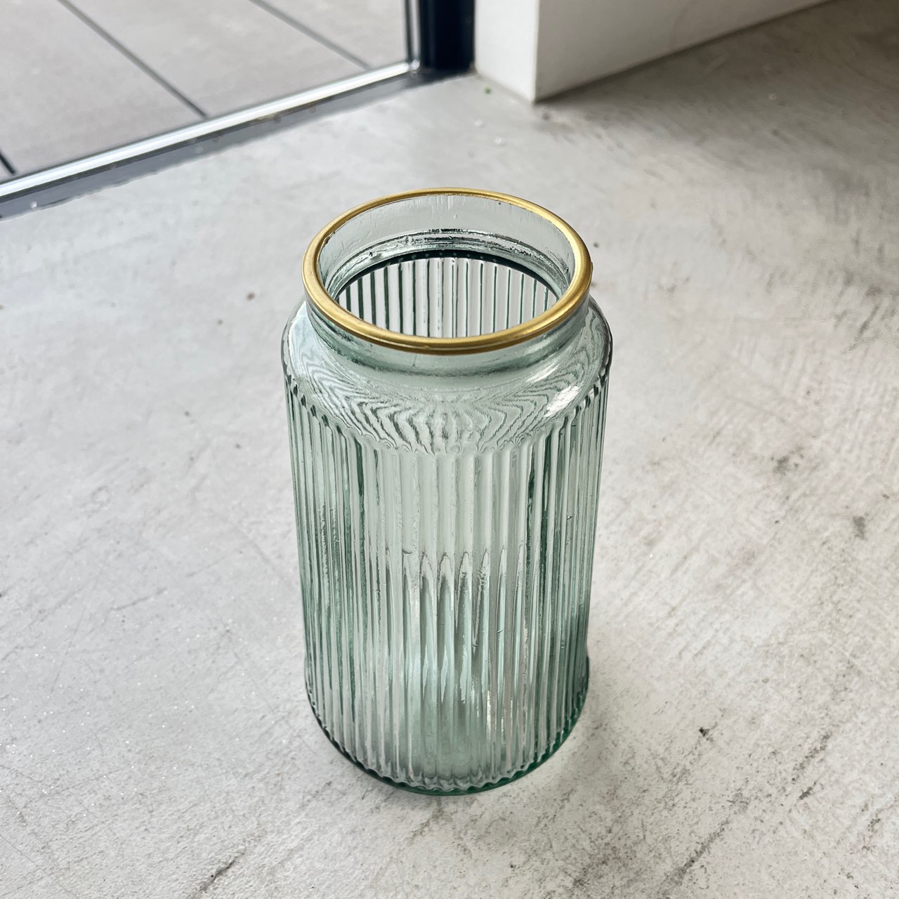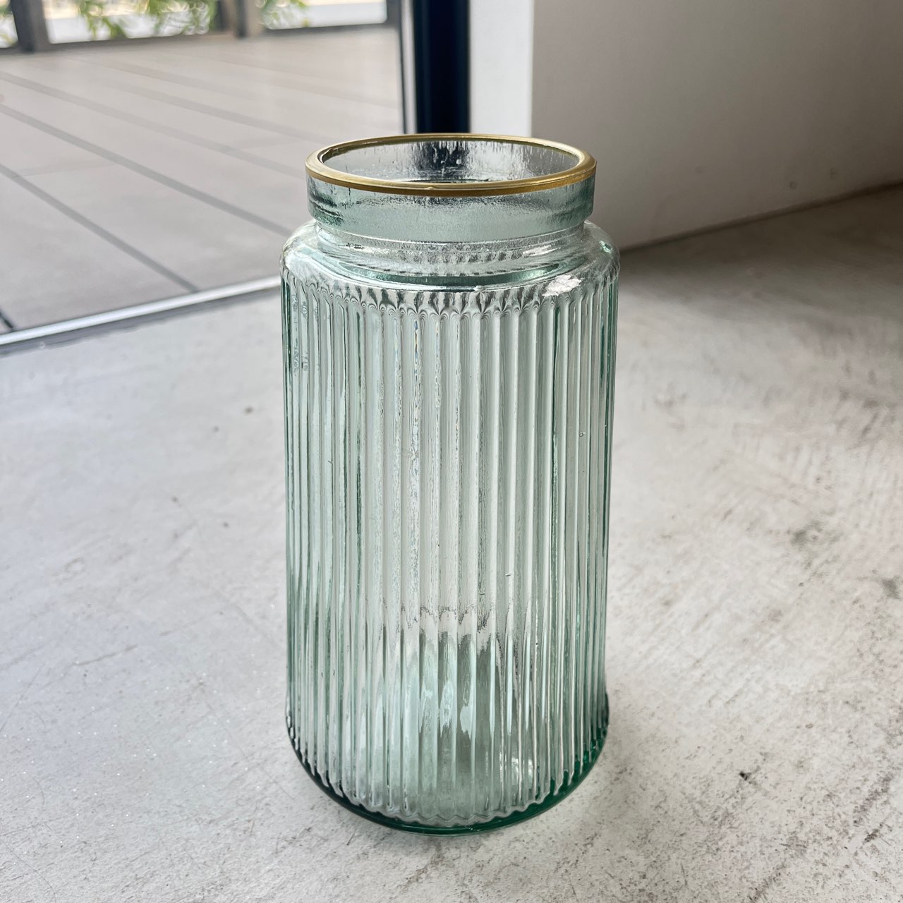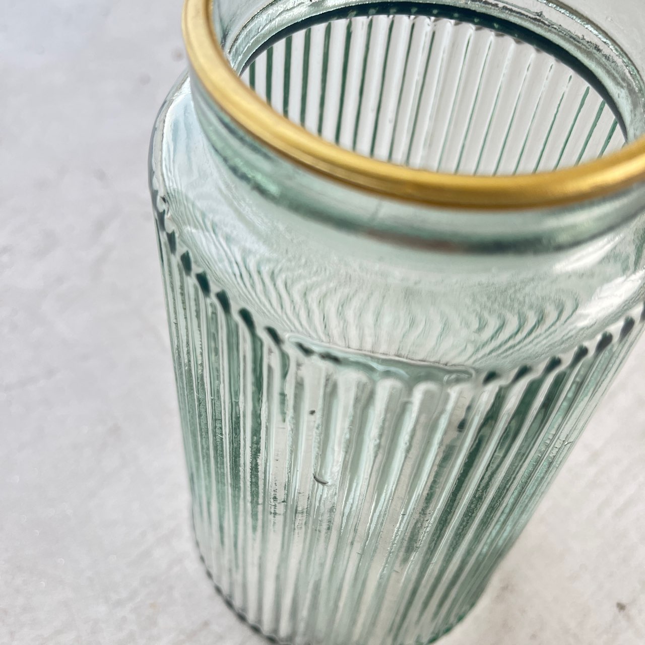 縦に入ったリブ模様が凛とした印象を与える、ガラスのフラワーベース。