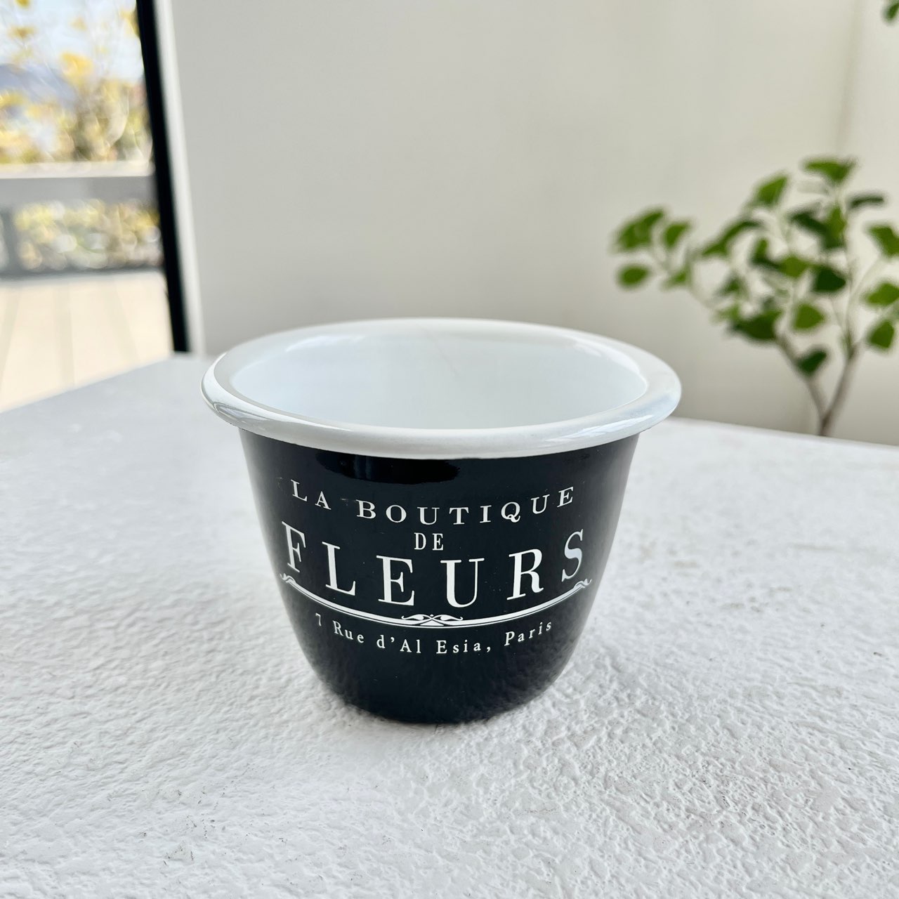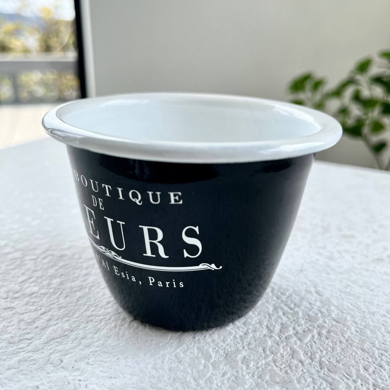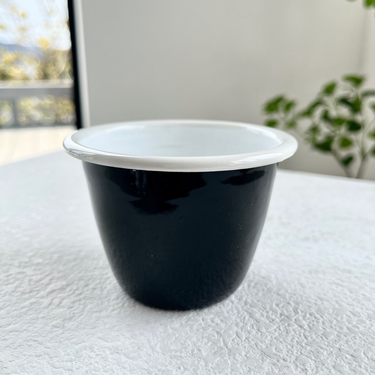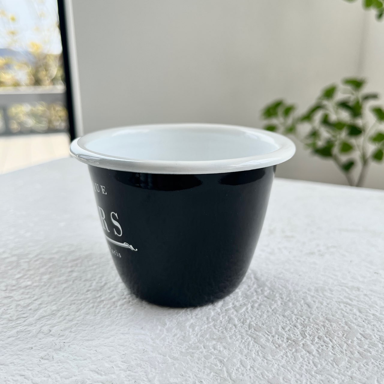 シックなデザインが魅力の、ホーロー仕上げのカップ。