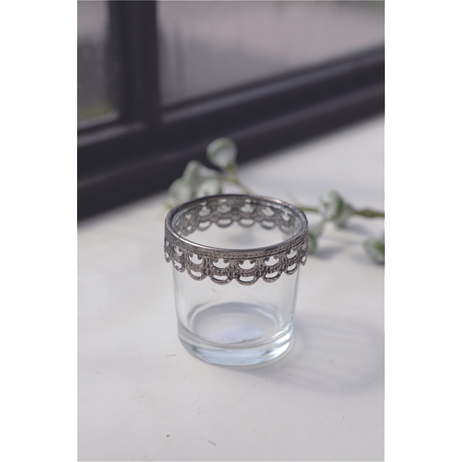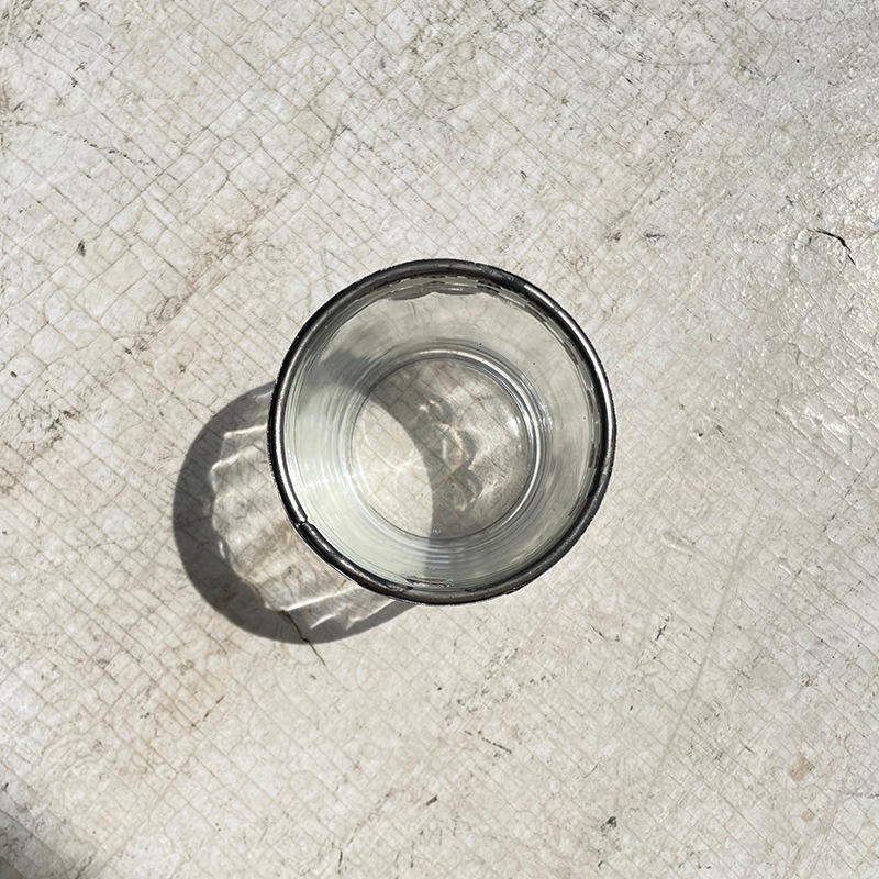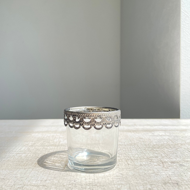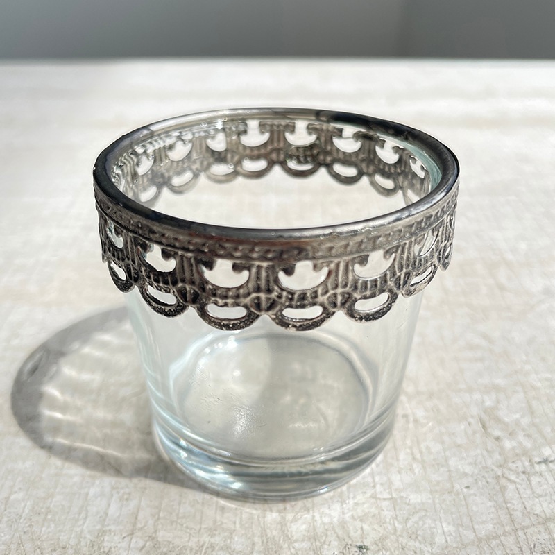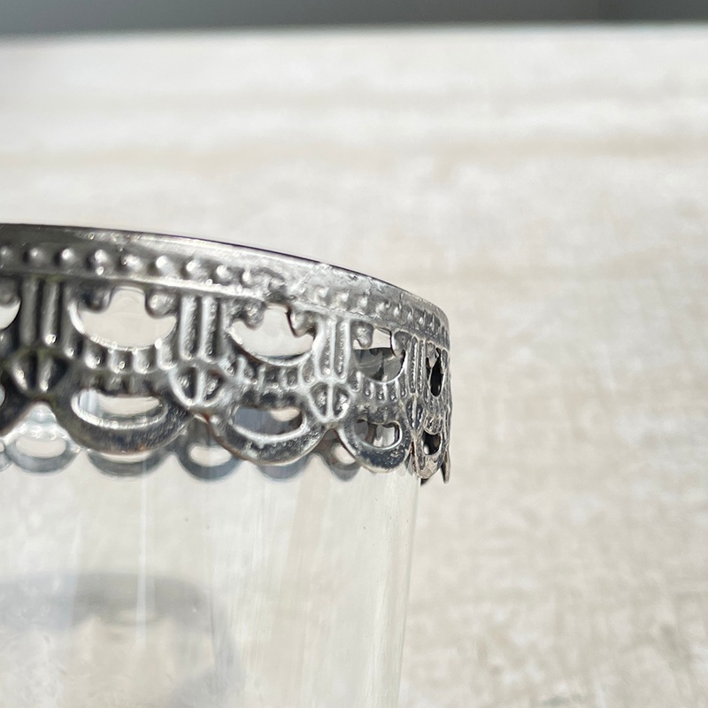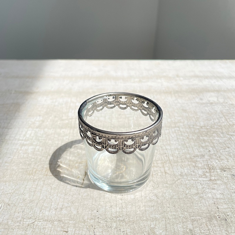 繊細なメタルのレースが施された、手のひらサイズのガラスのミニカップ。