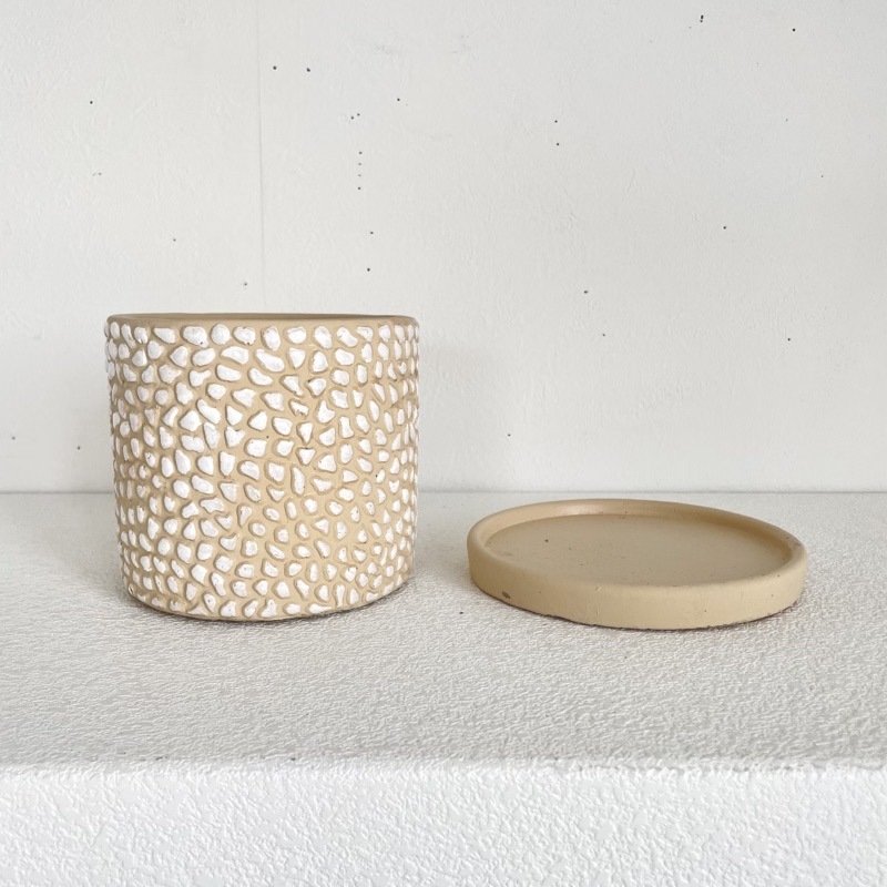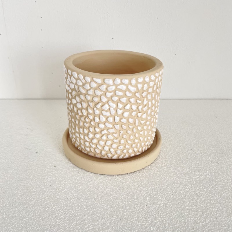 温かみのあるベージュのベースに、無数の小石が敷き詰められたかのような立体的な模様が施されています。