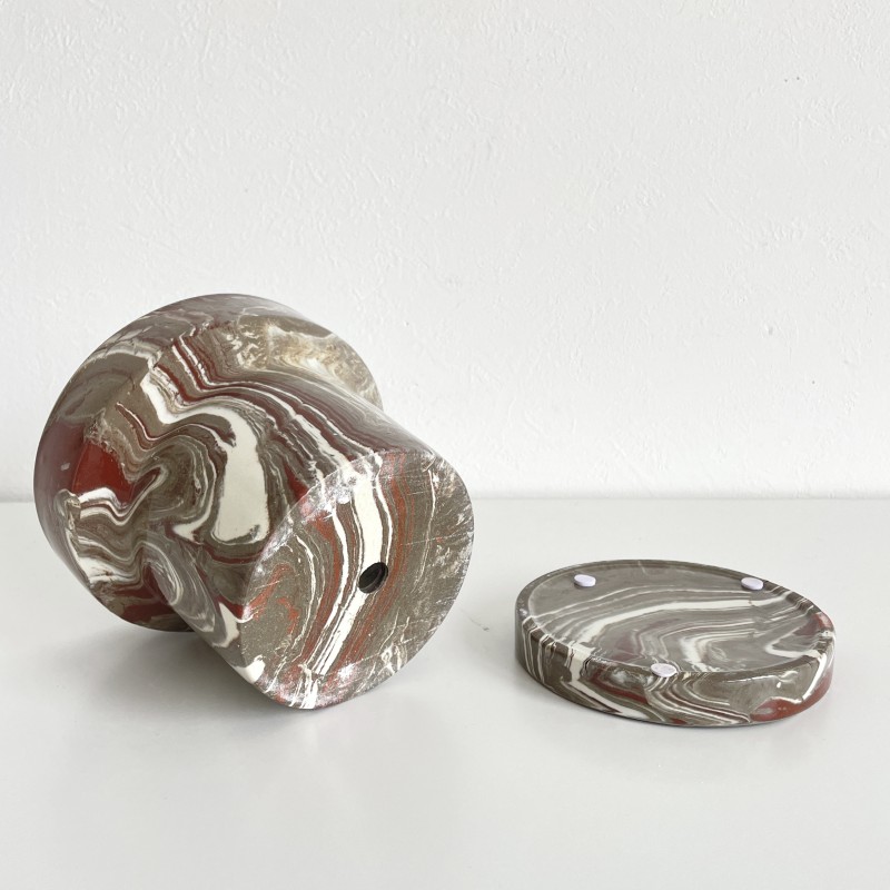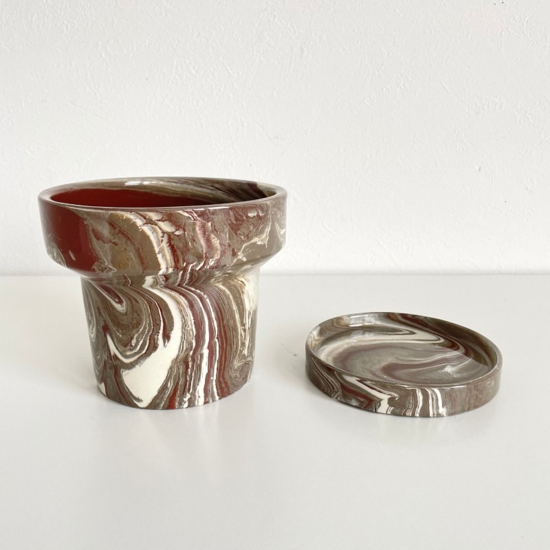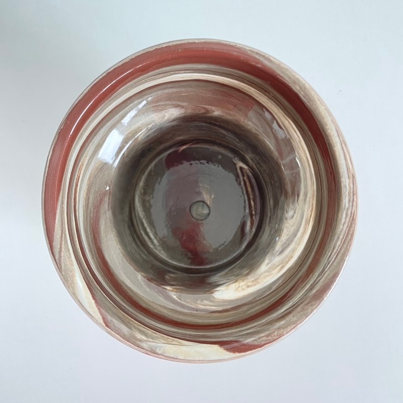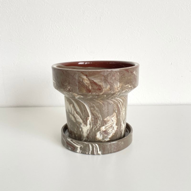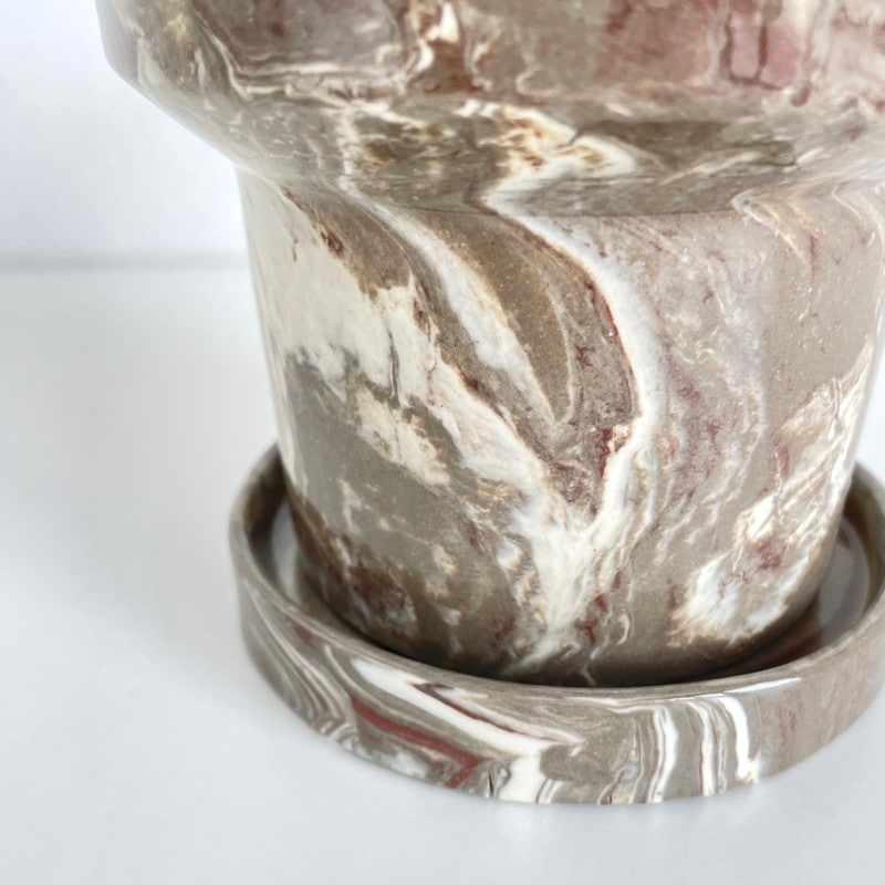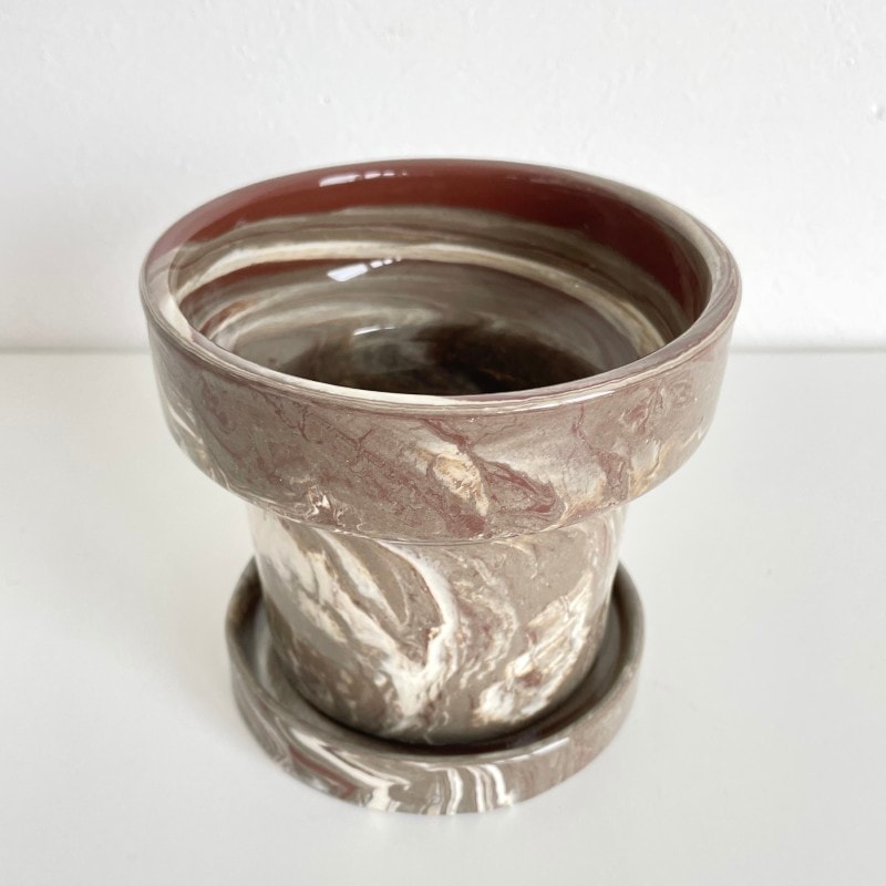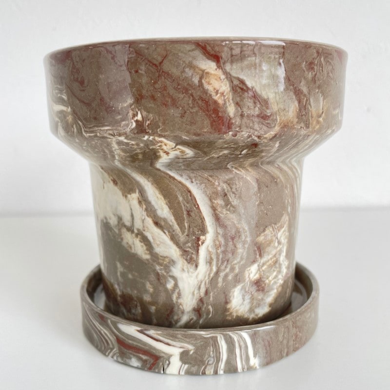 温かみのあるブラウン系のマーブル模様が印象的な、存在感のあるフラワーポット。