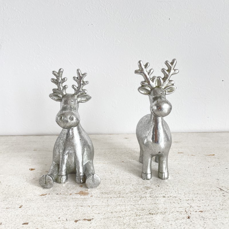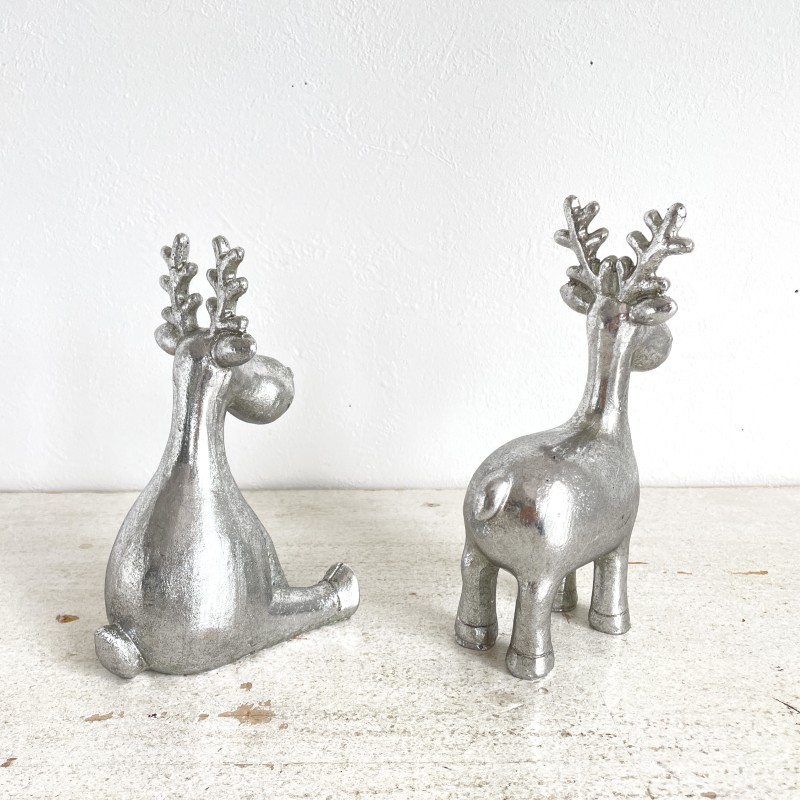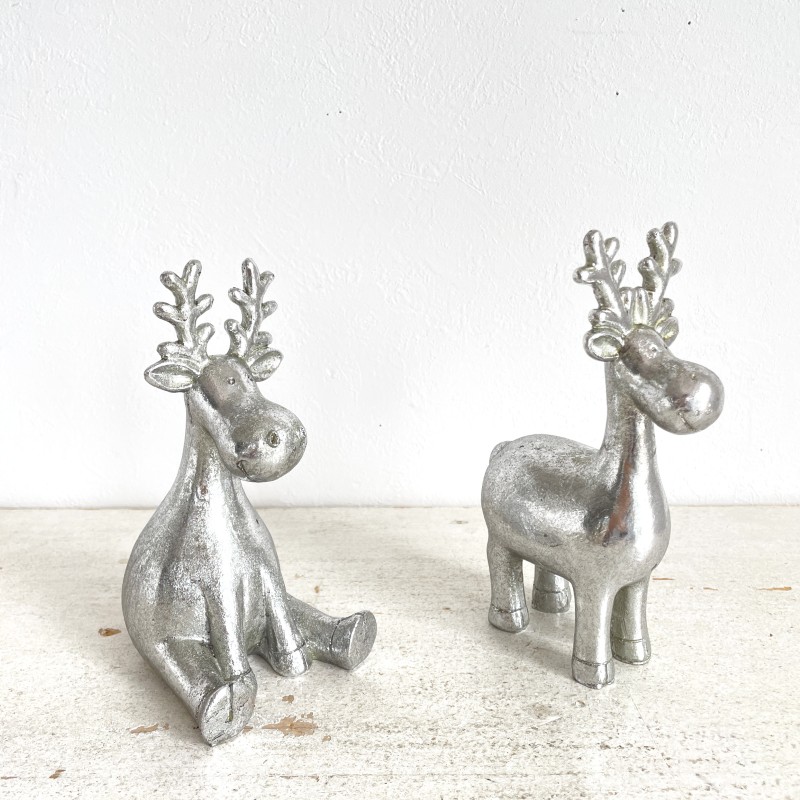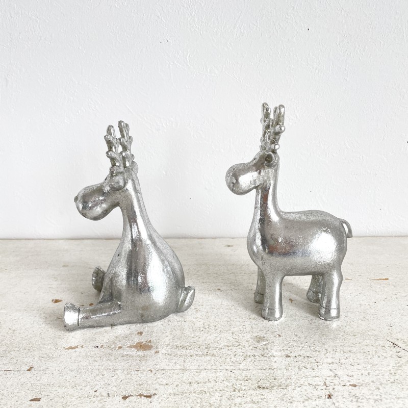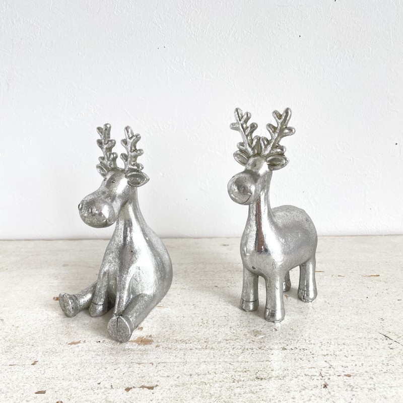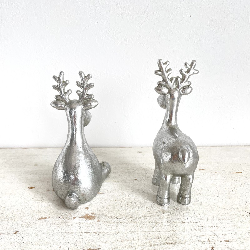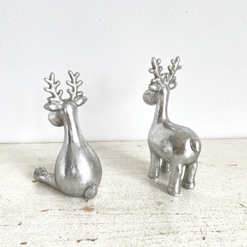 洗練されたシルバーカラーが美しい、2ポーズのトナカイのオブジェセット。