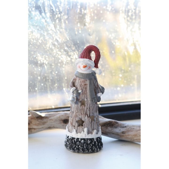 暖かそうなニット帽をかぶり、愛らしい表情を浮かべた雪だるまのLEDライトです。
