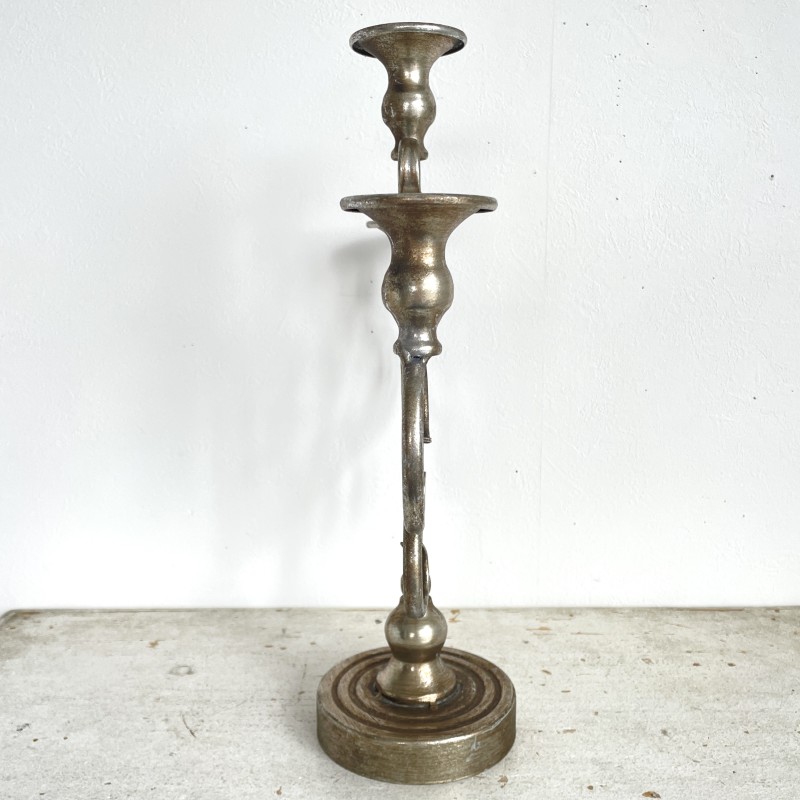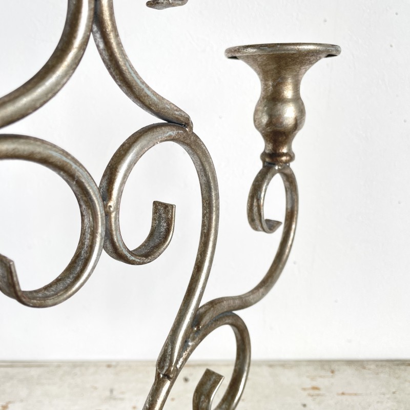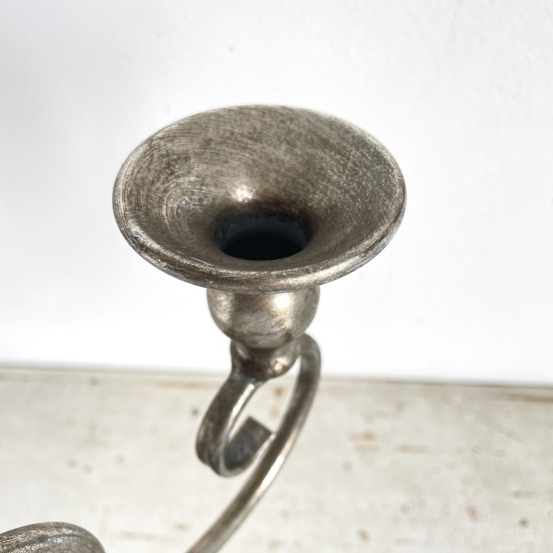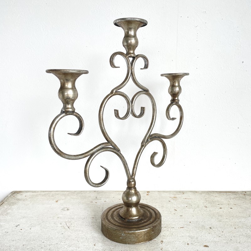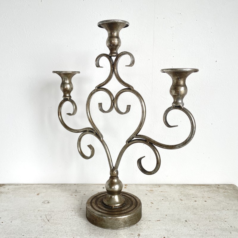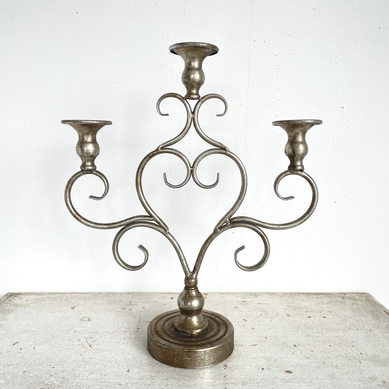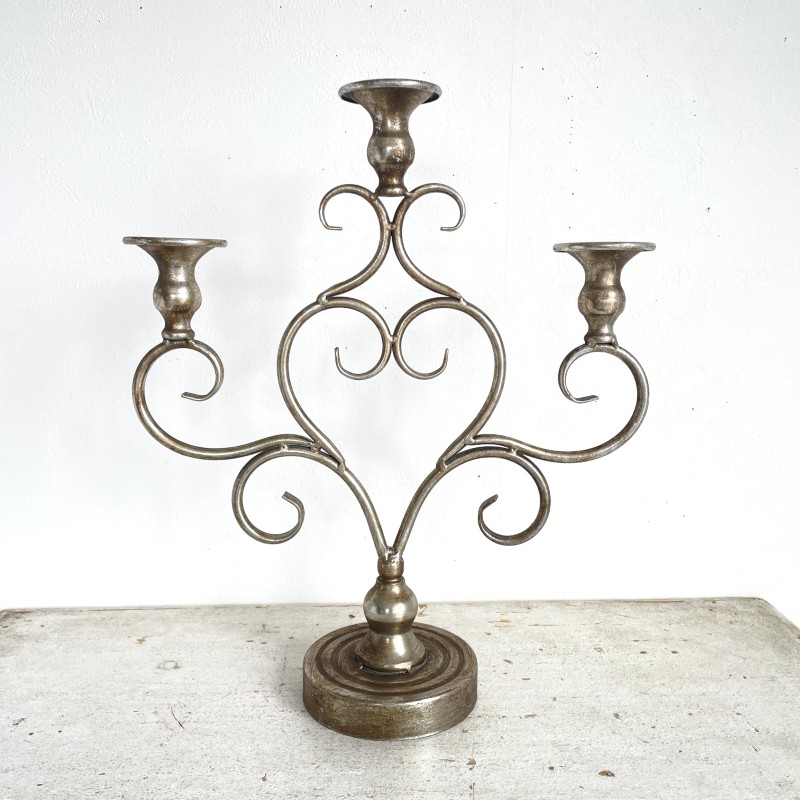 アンティークな風合いの落ち着いたシルバーが美しい、3本立ての燭台。