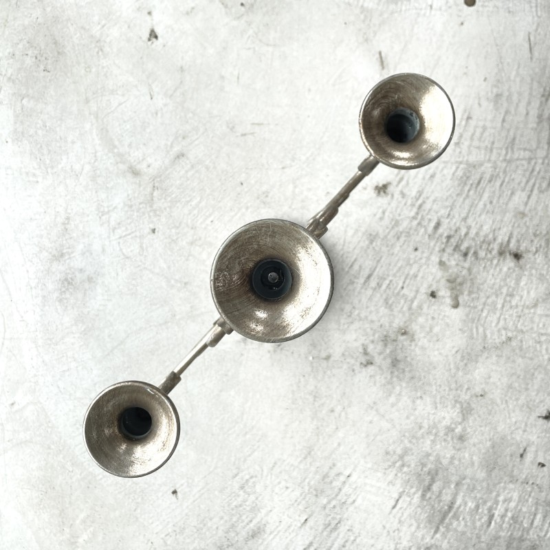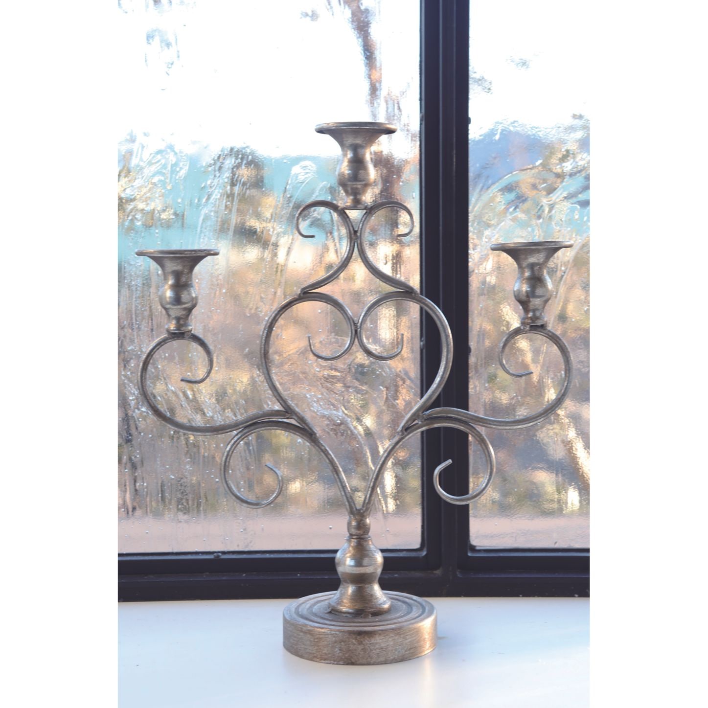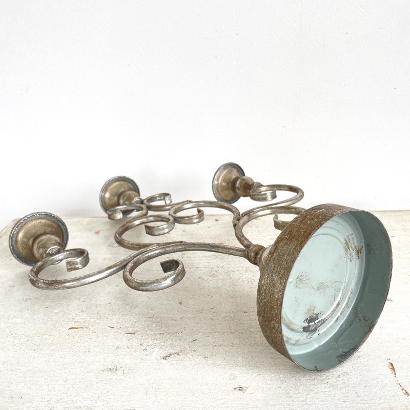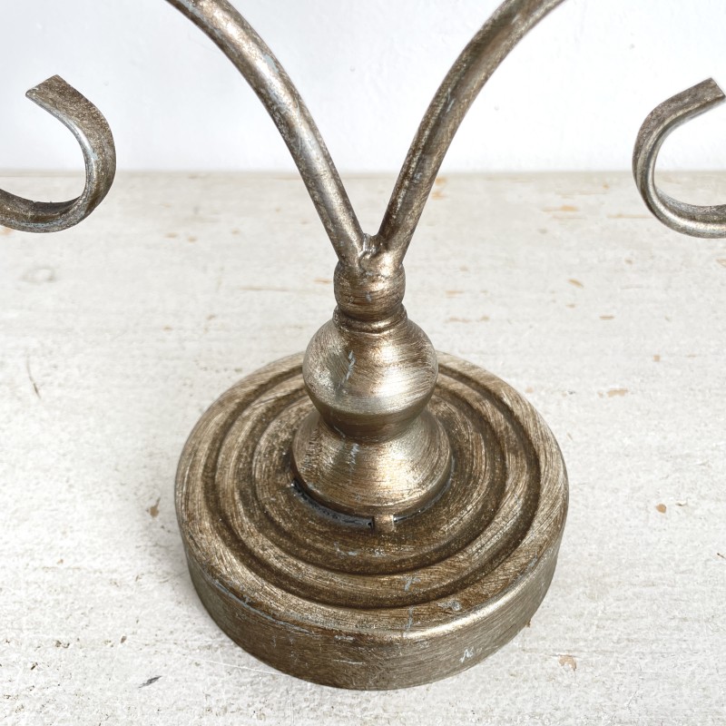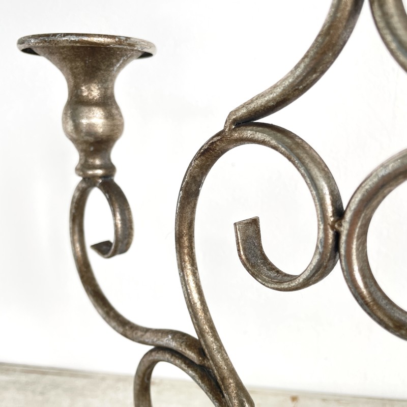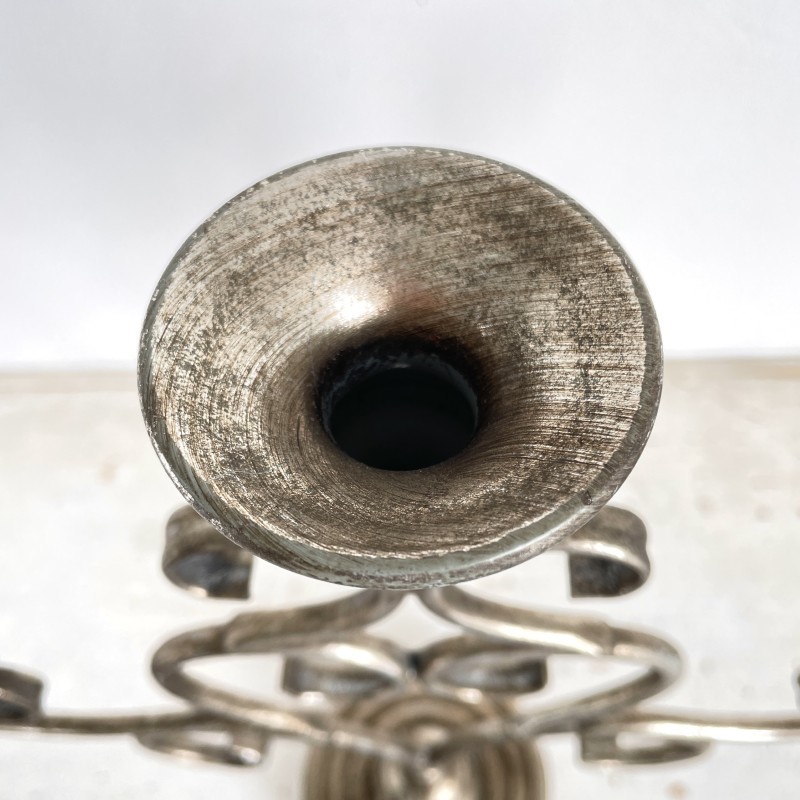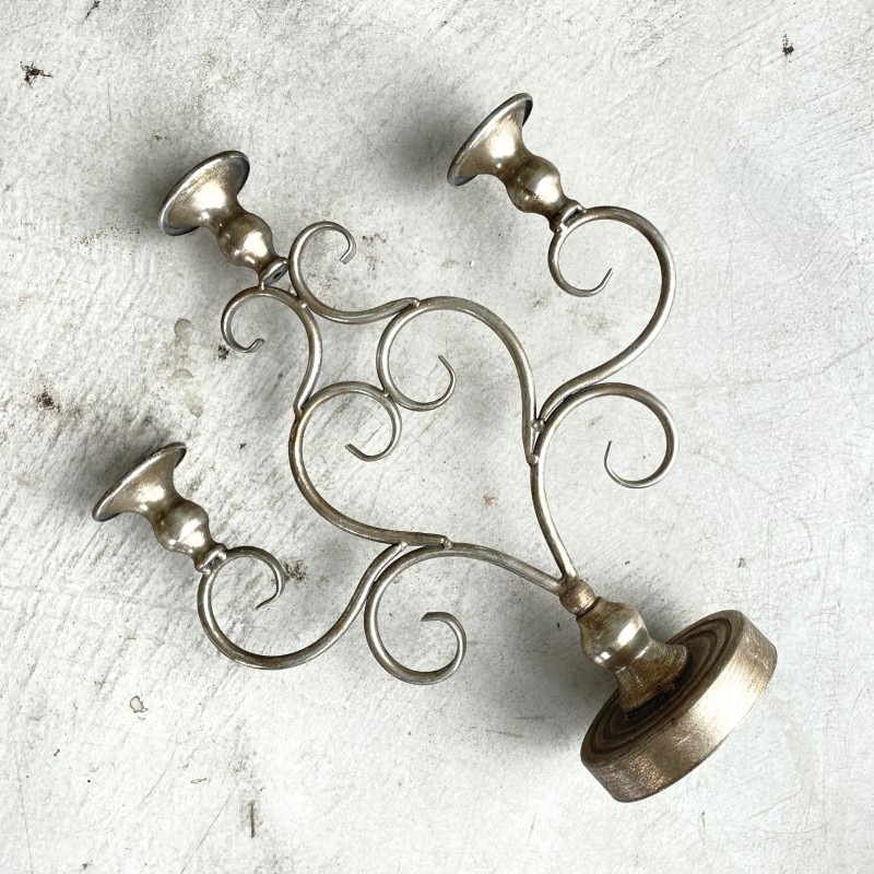 アンティークな風合いの落ち着いたシルバーが美しい、3本立ての燭台。